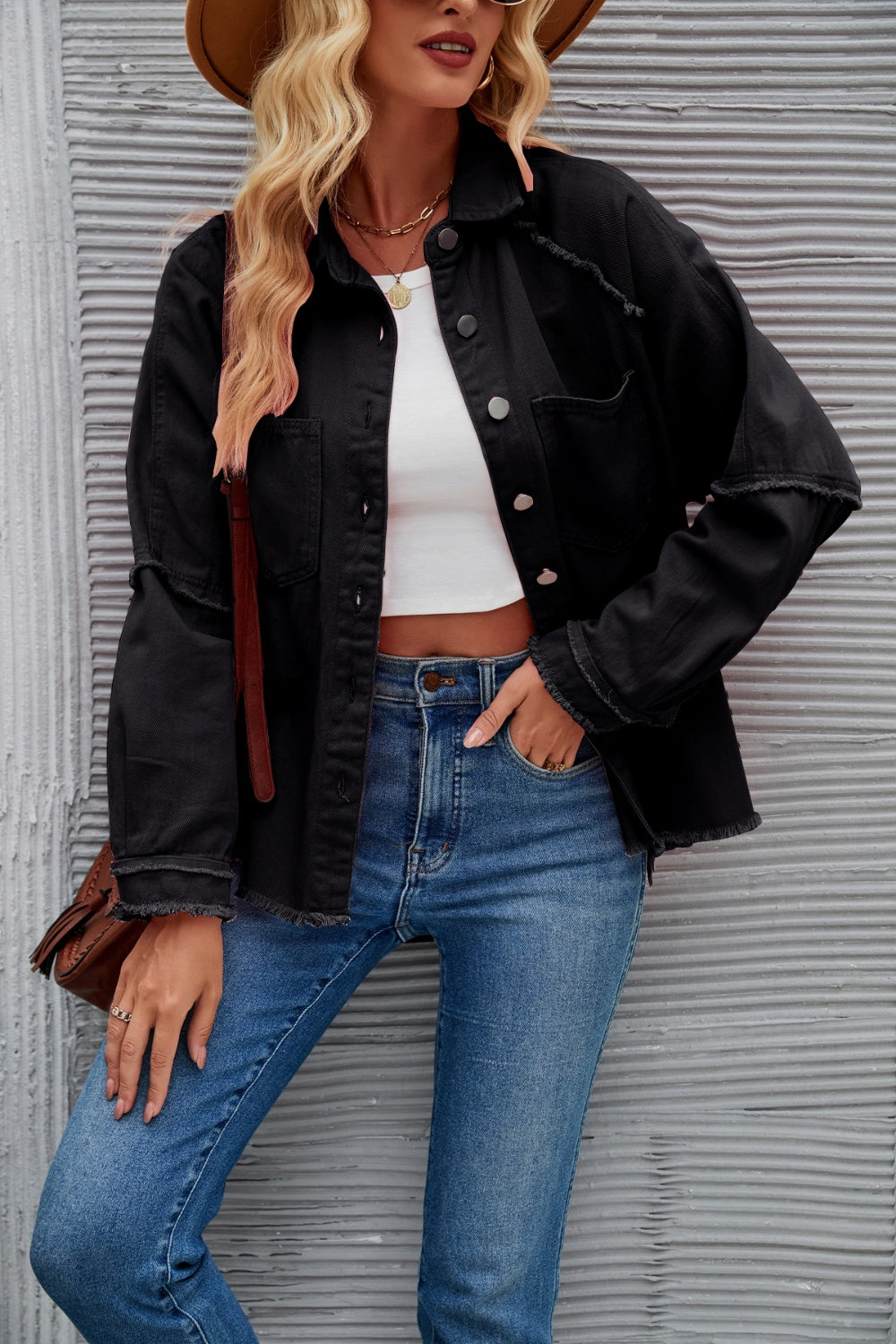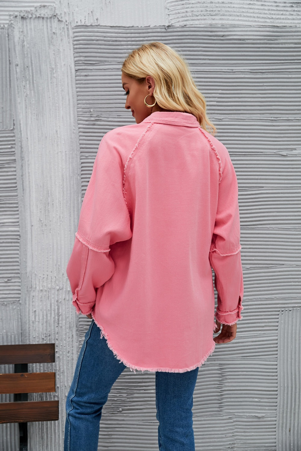 - Features: Buttoned, Raw hem, Pocketed
