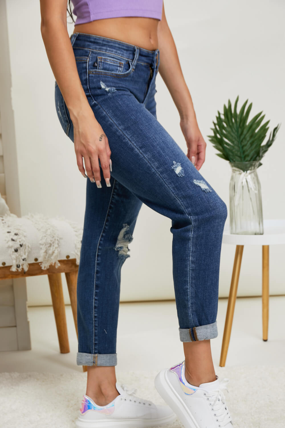 Slim jeans are a staple for your denim collection! These ones have a mid-rise waist and can be worn cuffed or uncuffed.