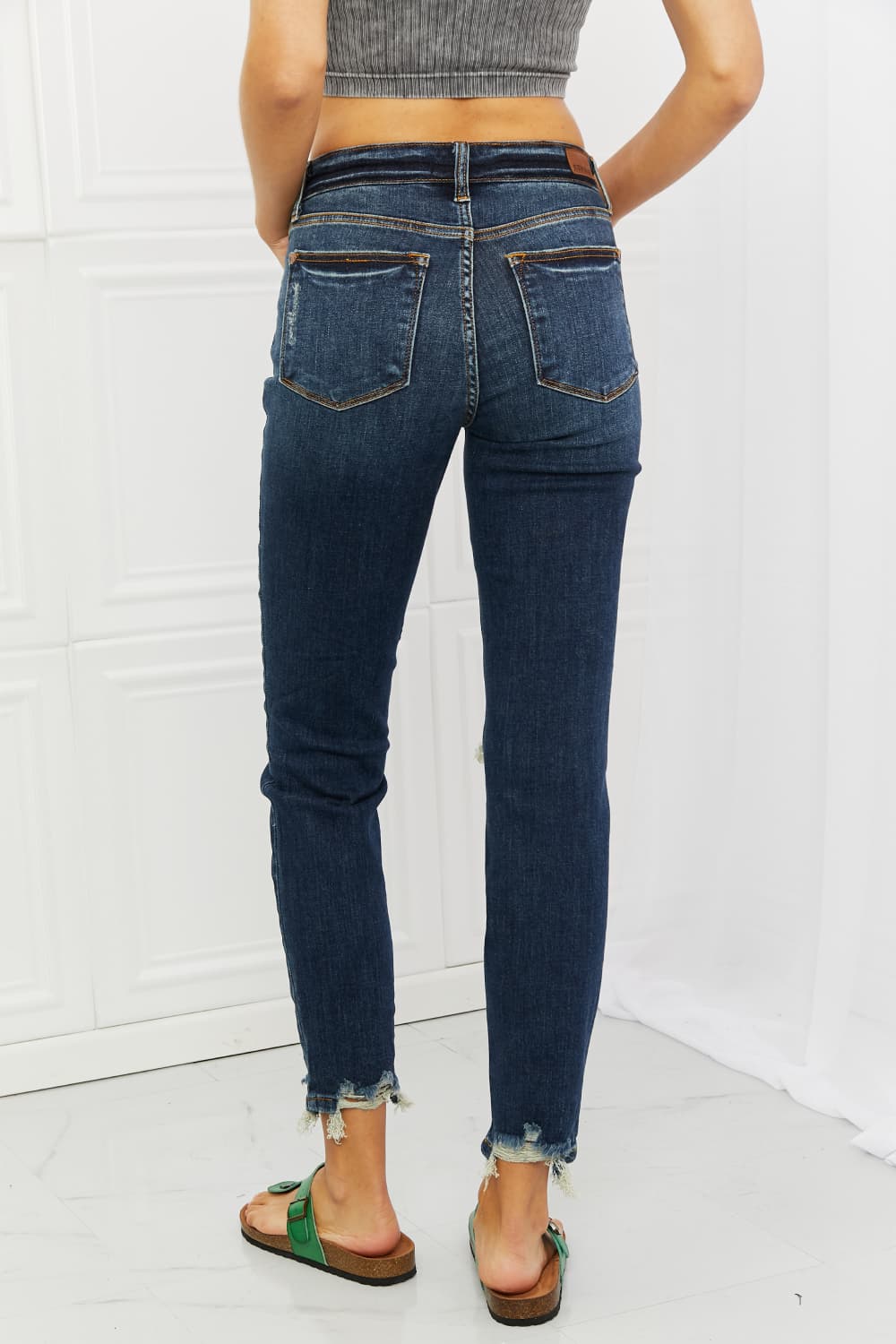 Crafted from high-quality denim, these jeans are designed to elevate your wardrobe with their contemporary style and comfortable fit. The dark wash of these jeans adds a touch of sophistication to any outfit, while the mid rise waistline provides a flattering silhouette that complements your curves. The length is perfect for showing off your favorite pair of shoes or boots, and the raw hem gives the jeans a laid-back, casual feel. But what really sets these jeans apart is the right knee distressing, which adds a unique edge to your look. The distressing is subtle enough to not overpower the rest of the jeans, but adds just the right amount of character and personality.