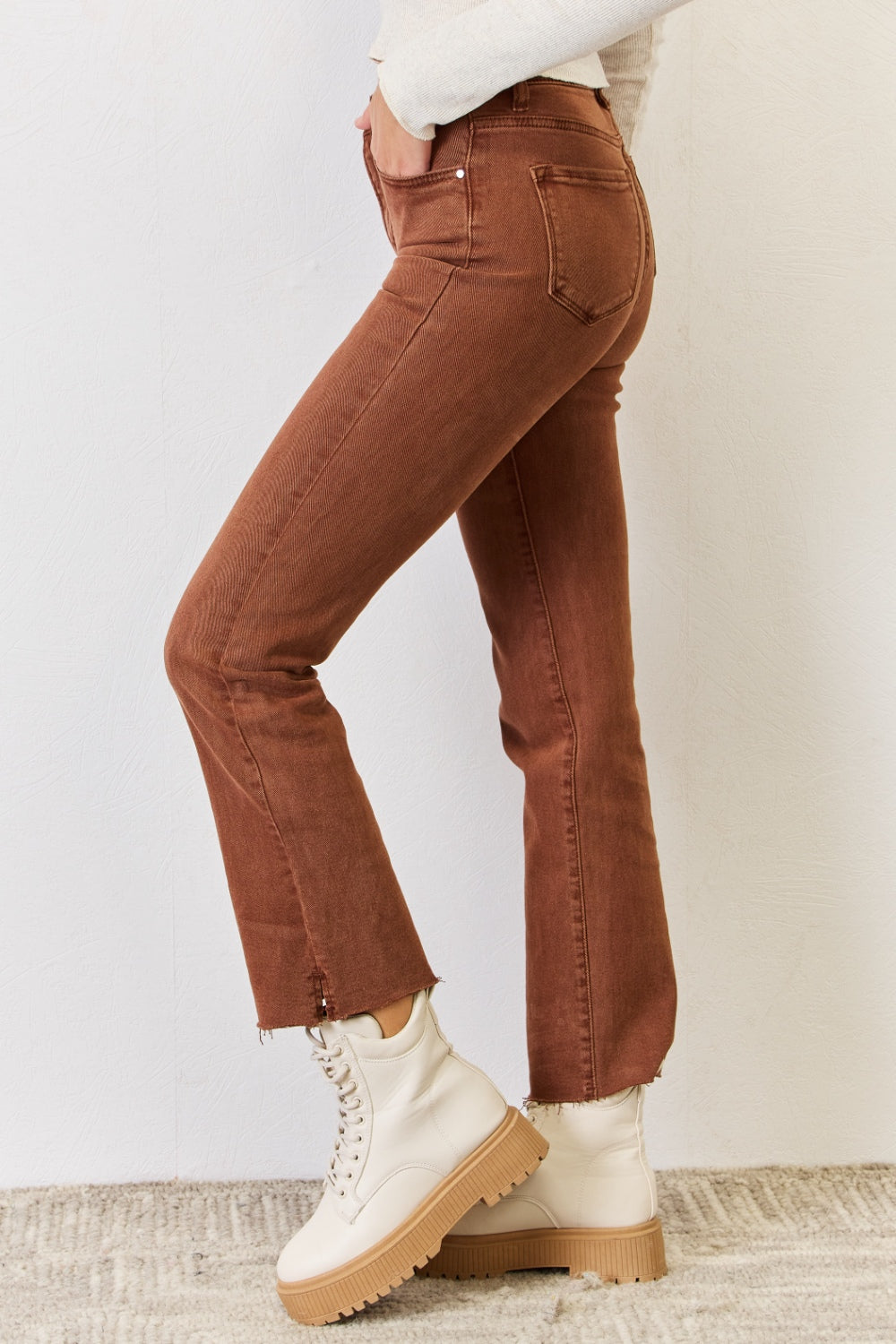 These jeans offer a flattering high-rise fit designed to accentuate your curves while providing excellent tummy control for a confident look. The raw hem detail adds a touch of edgy charm, making them a versatile choice for any occasion.