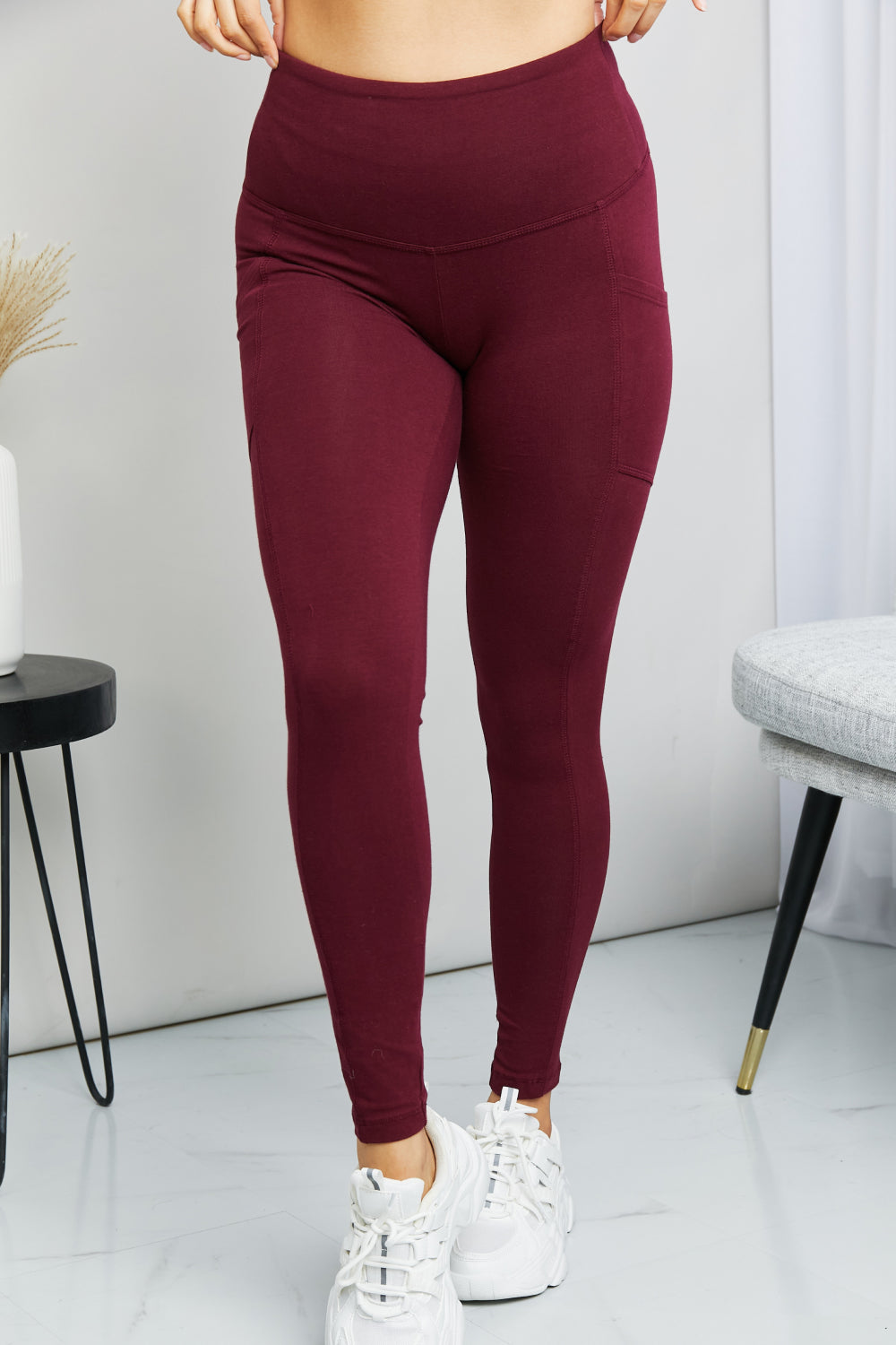 Zenana Ready to Roll Full Size Wide Waistband Pocket Leggings in Burgundy