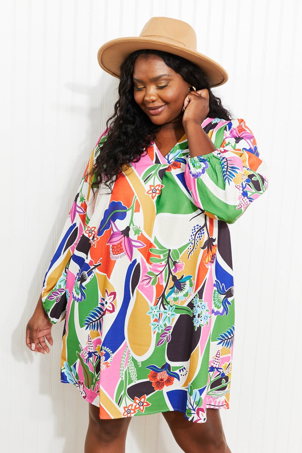 The groovy floral print on this dress is fun, bold, and bright! The long sleeves and airflow fabric make this a great transitional piece for changing seasons.
