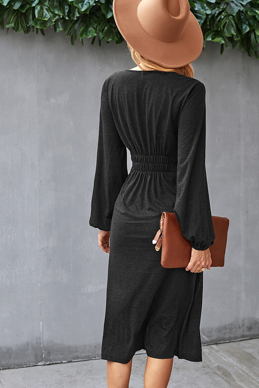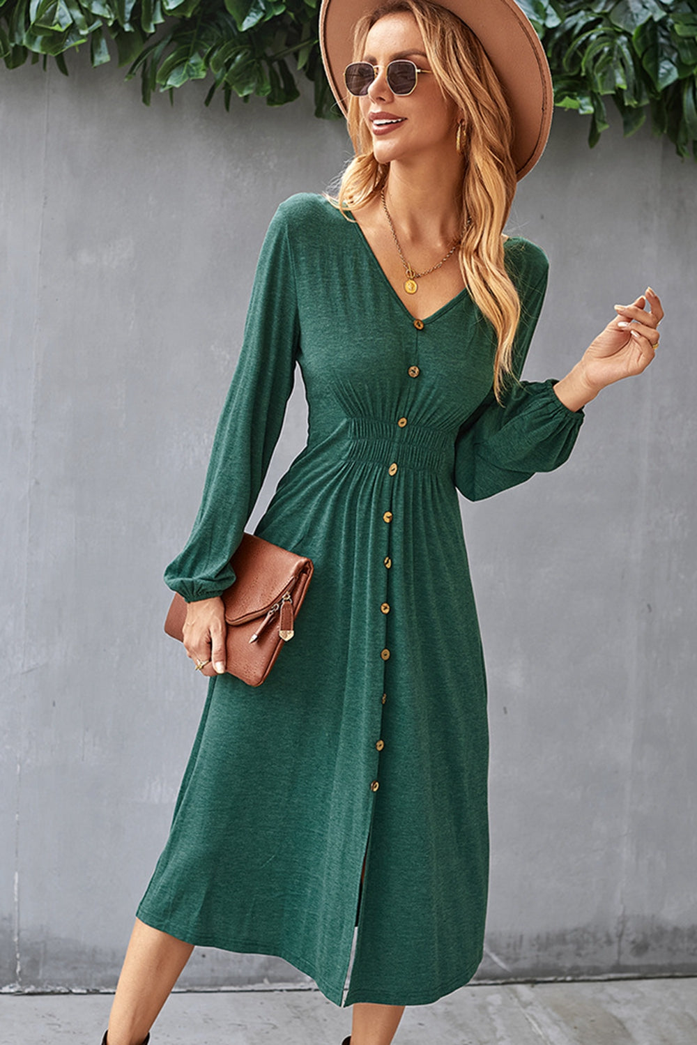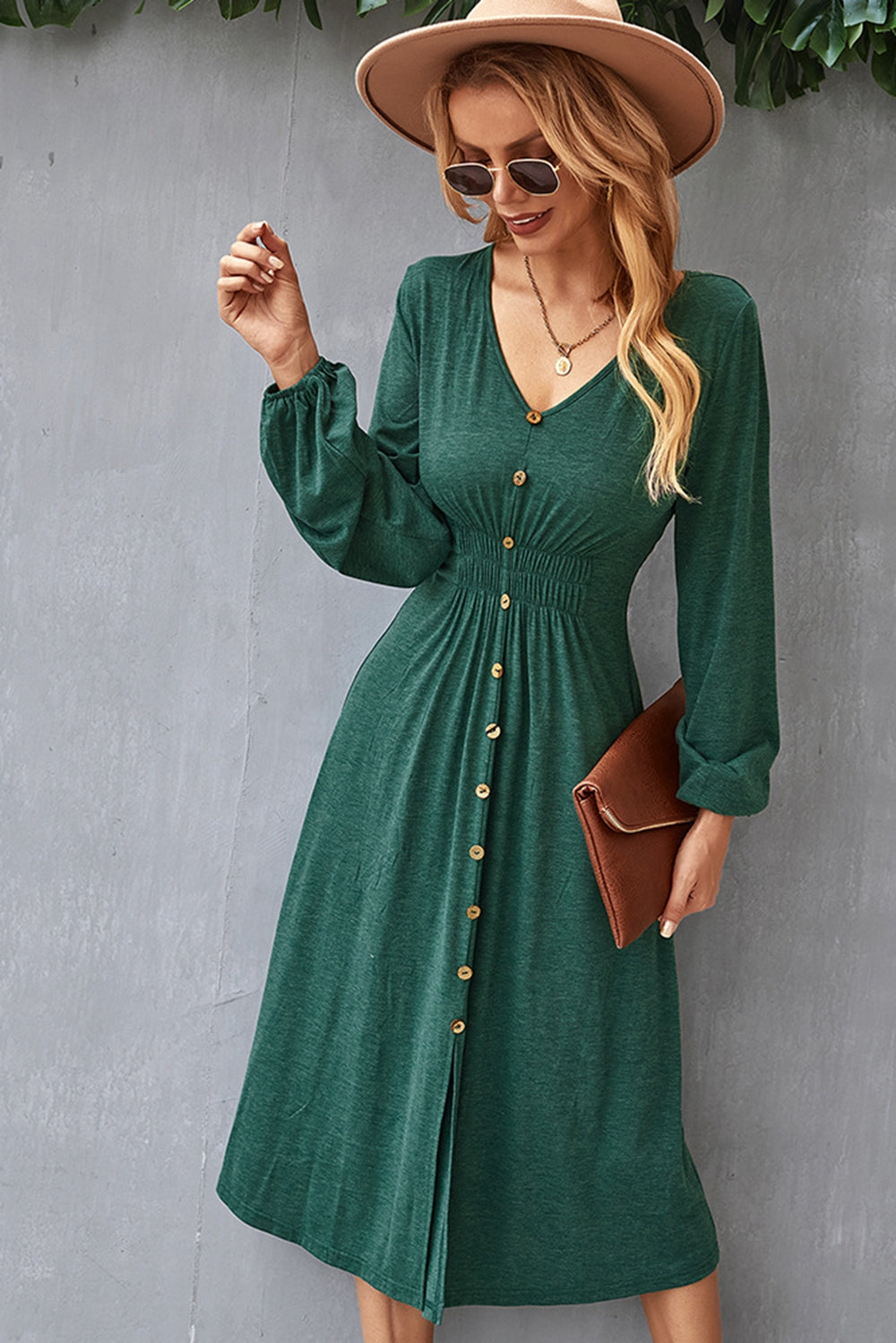 Decorative Buttons V-Neck Elastic Waist Knitted Dress