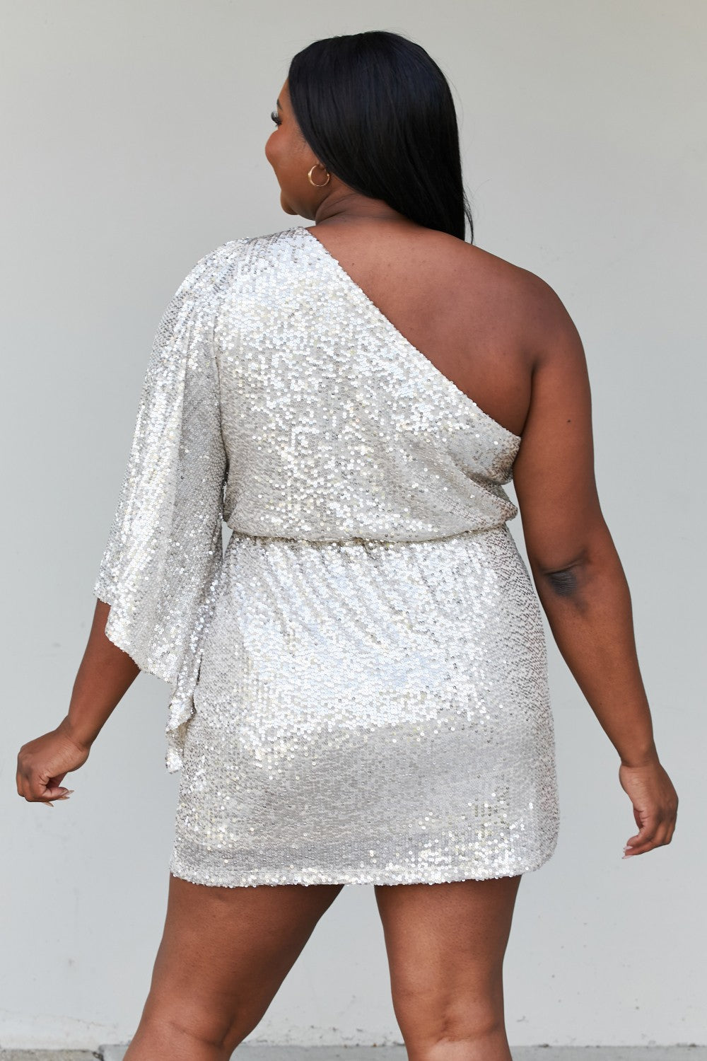 Get a boost of confidence in this beautiful sequined dress. The one-shoulder design and bell sleeve add glamour while the solid color adds to its casual chic style.