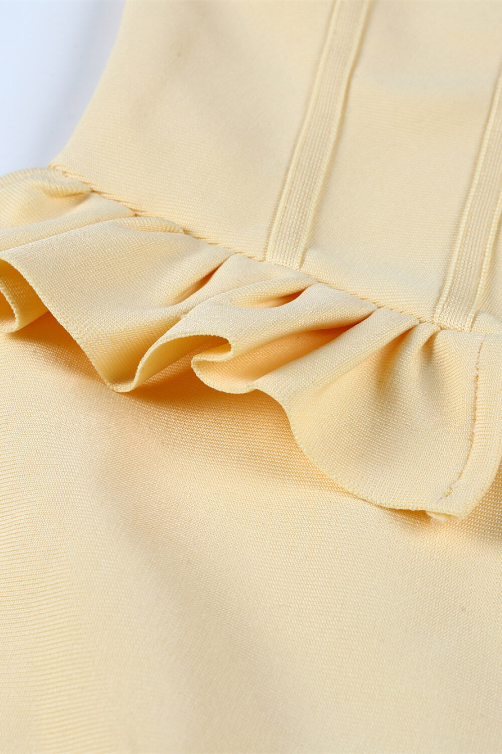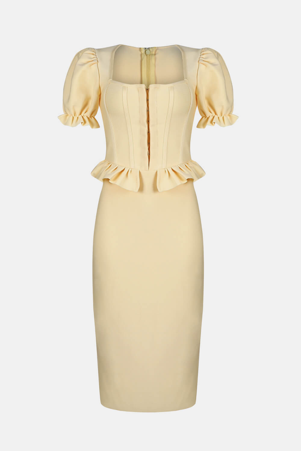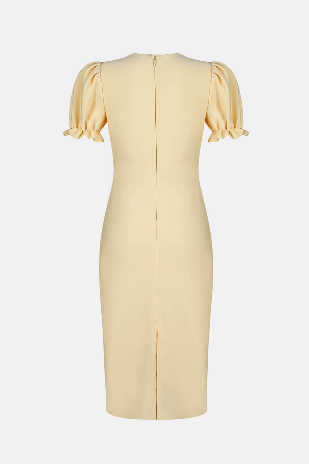 - Features: Short puff sleeves, zip back, knee-length, ruffled