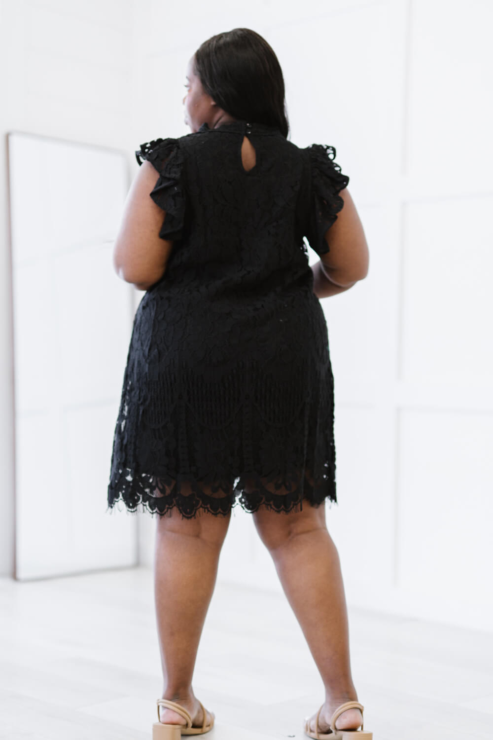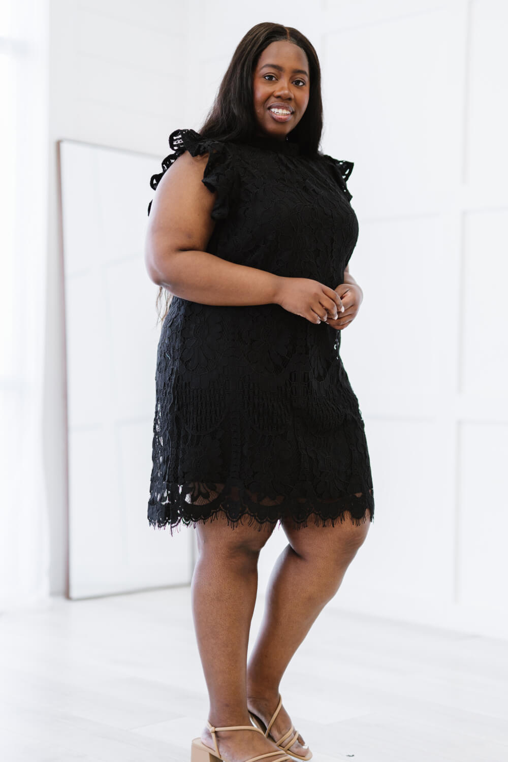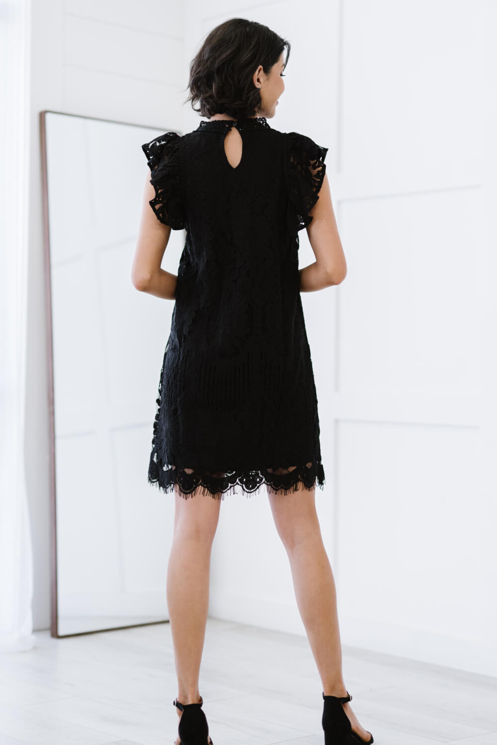A classic style, this stately lace dress features flutter sleeves, scalloped eyelash lace trim, and a mock neck. Pair with a statement necklace for an evening look.