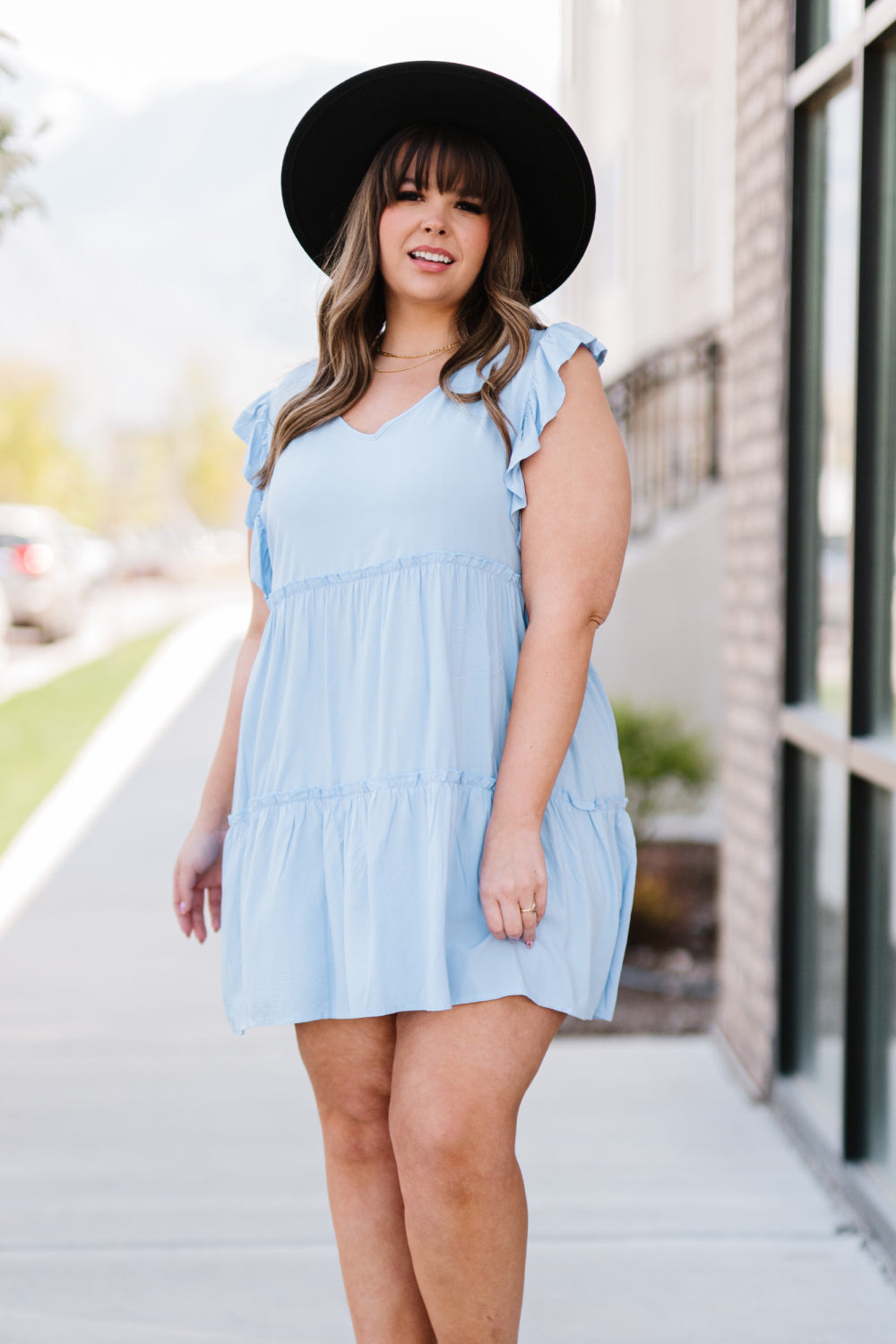 Tasteful and feminine, this mini dress is designed to impress! Flutter sleeves add a flowy detail, and the tiered silhouette is trending. Style it casually with some sandals and a sunhat, or dress it up a bit more with some heels and jewelry.