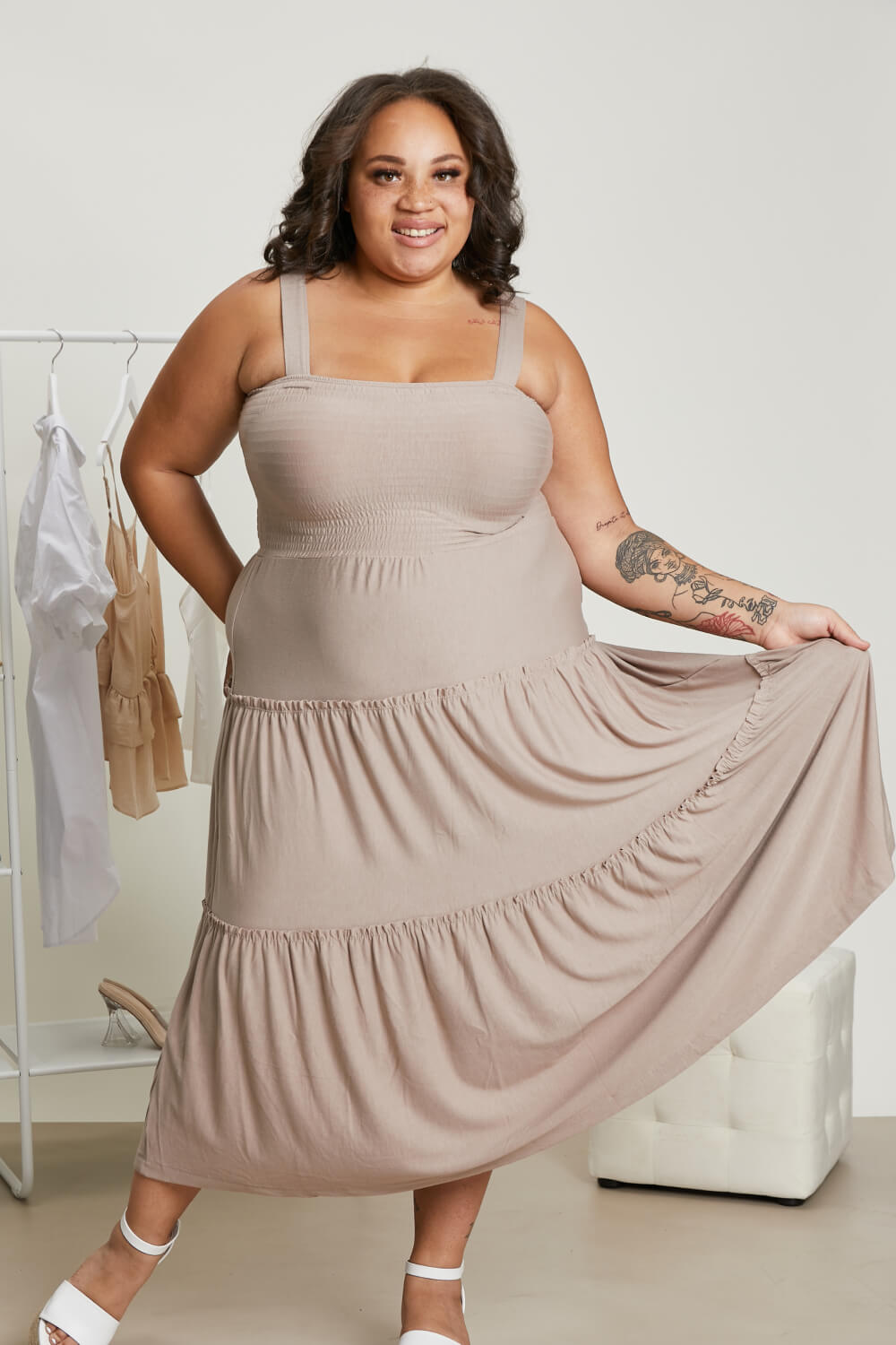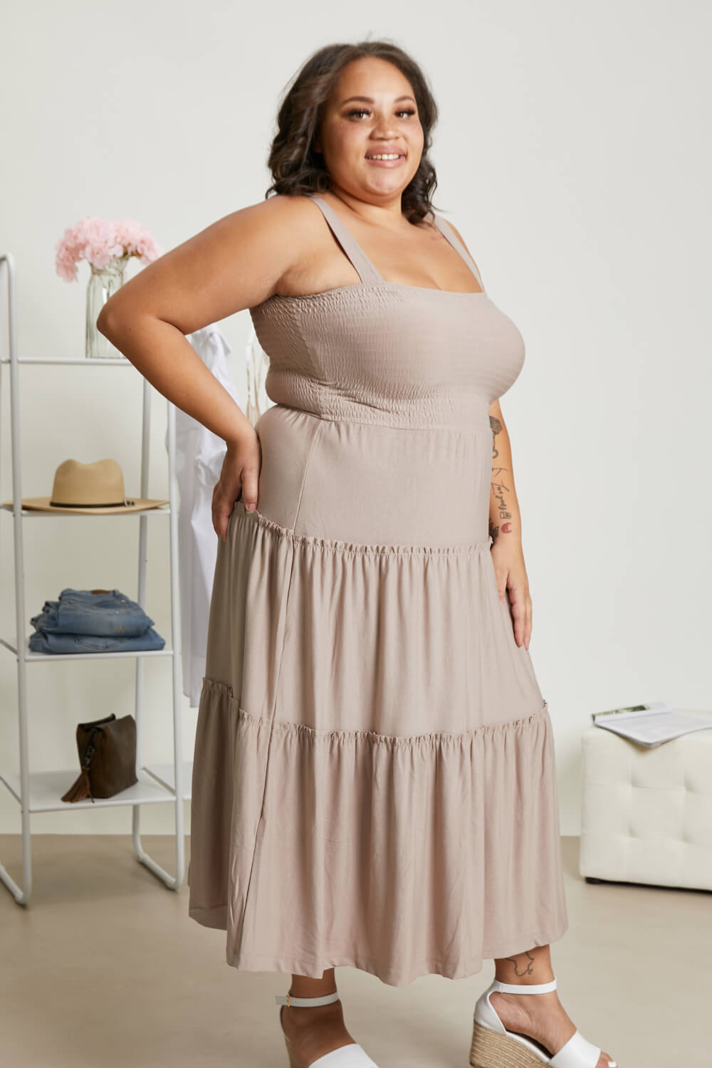 This sleeveless midi dress is sure to be a new favorite in your closet. The smocking at the bust flatters all, and the tiered design is right on trend.