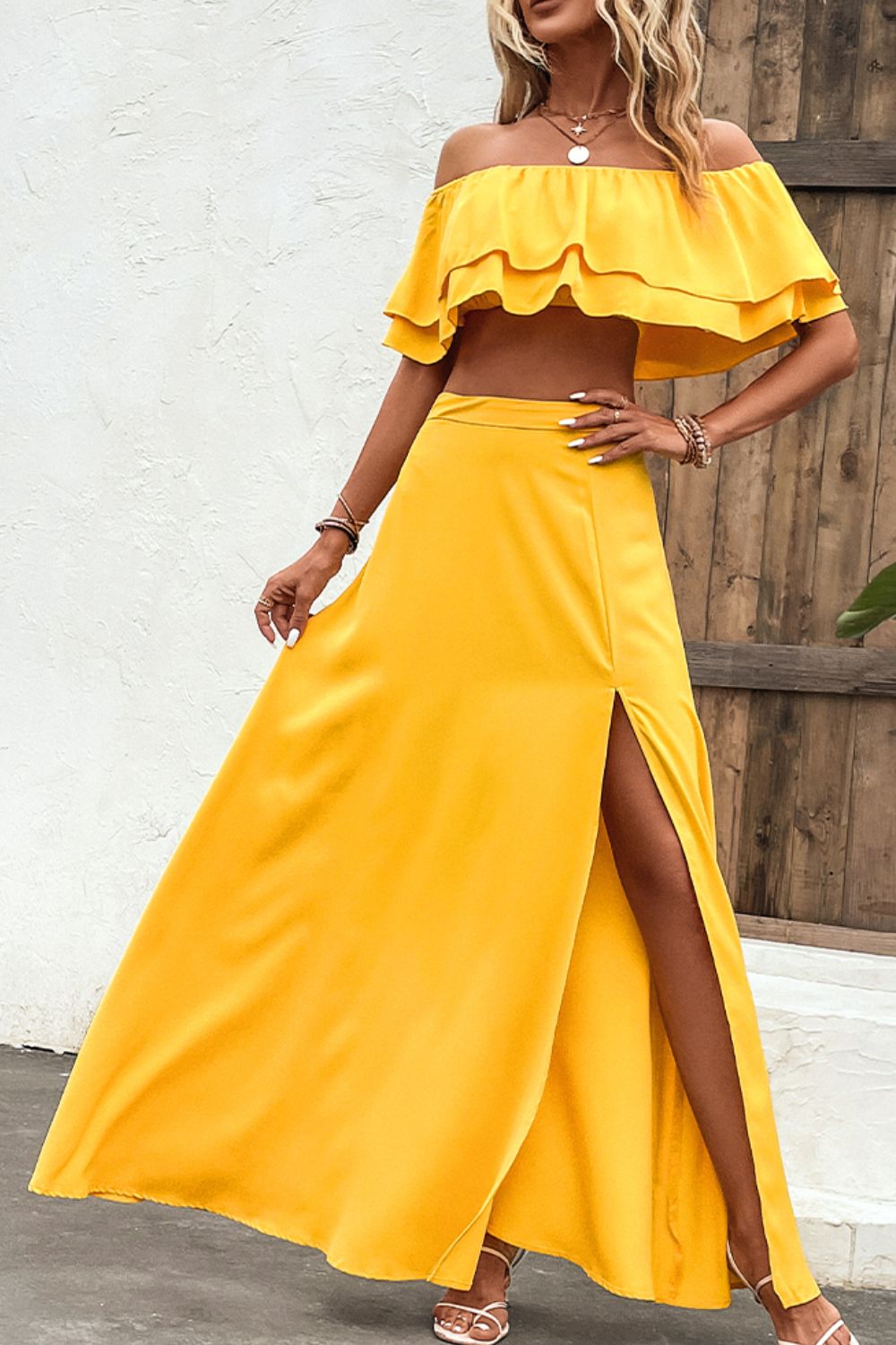 - Neckline: Off-shoulder
