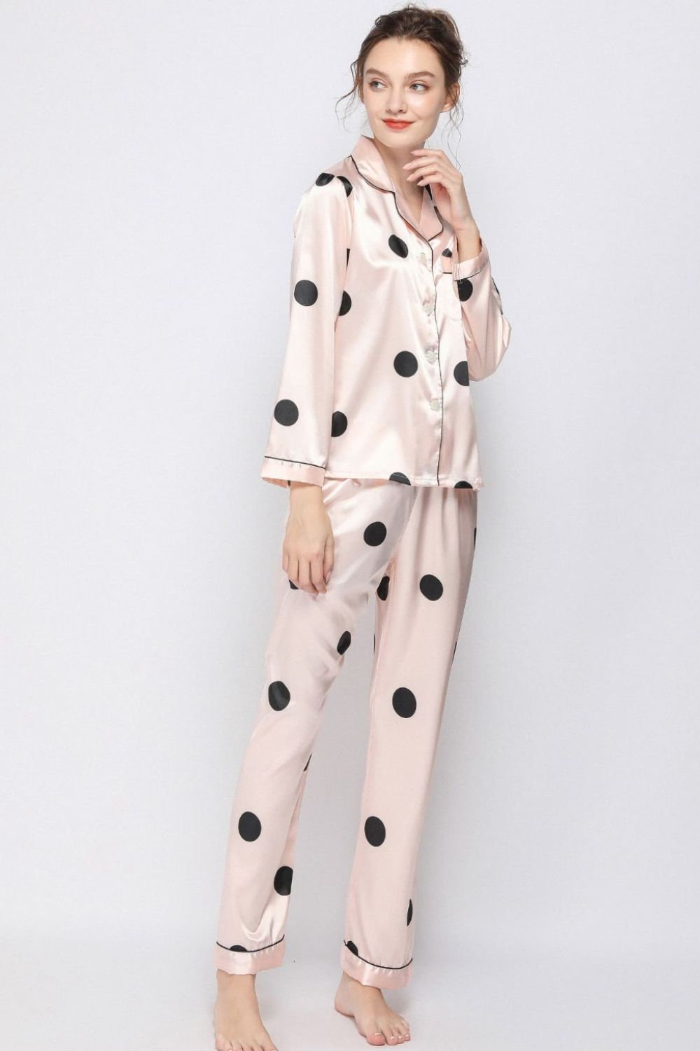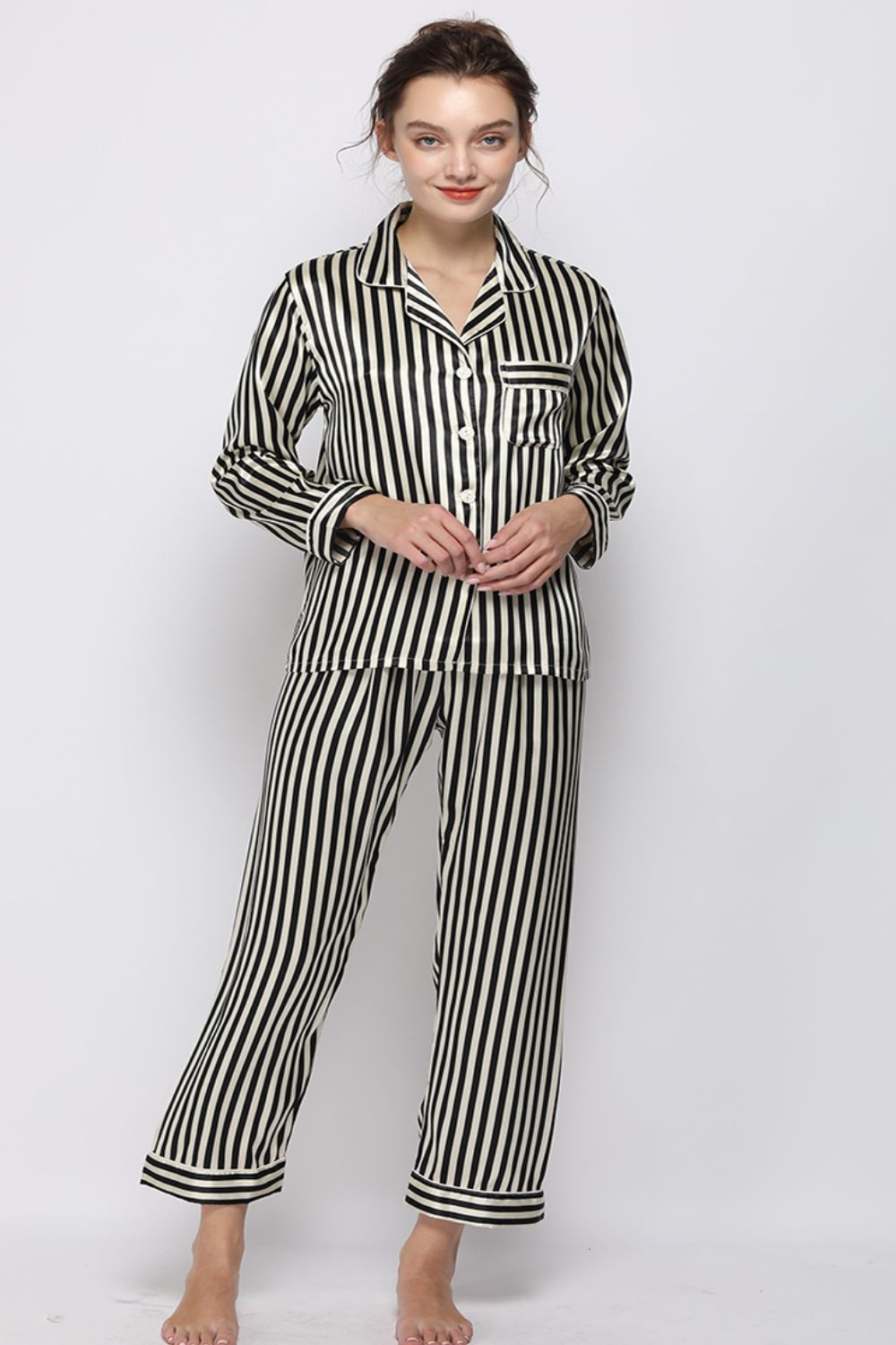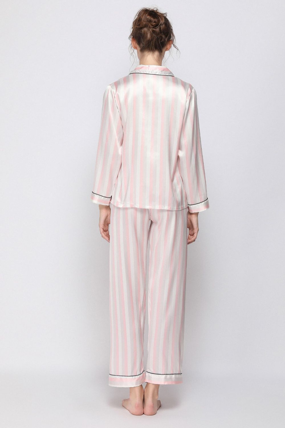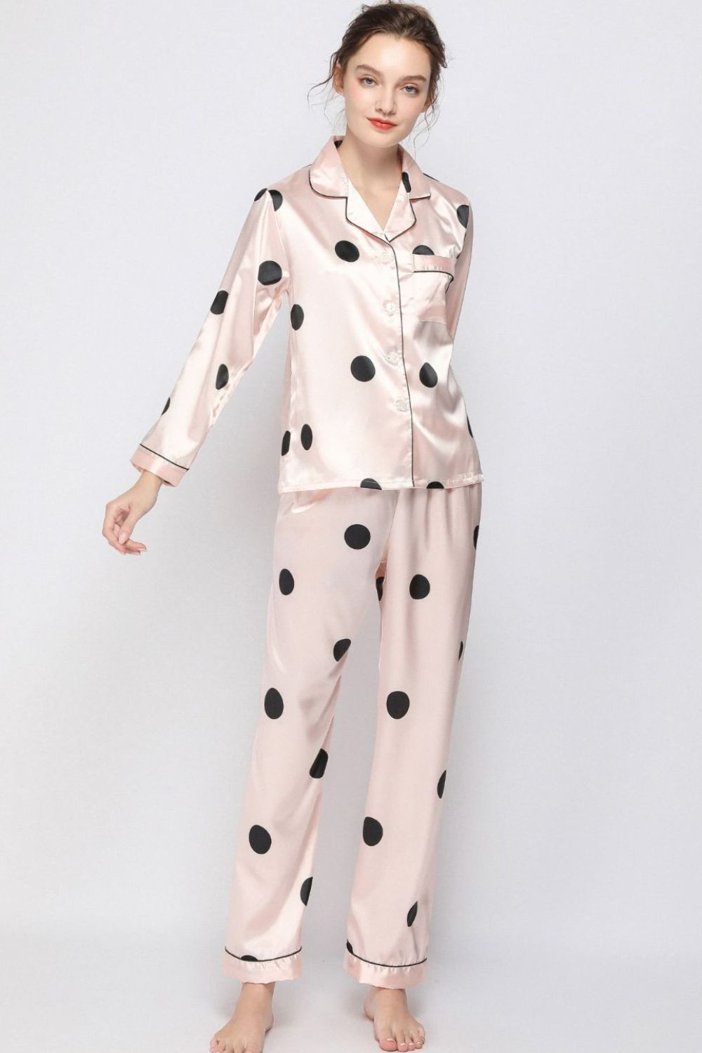 Satin Button-Up Lapel Collar Top and Pants Pajama Set