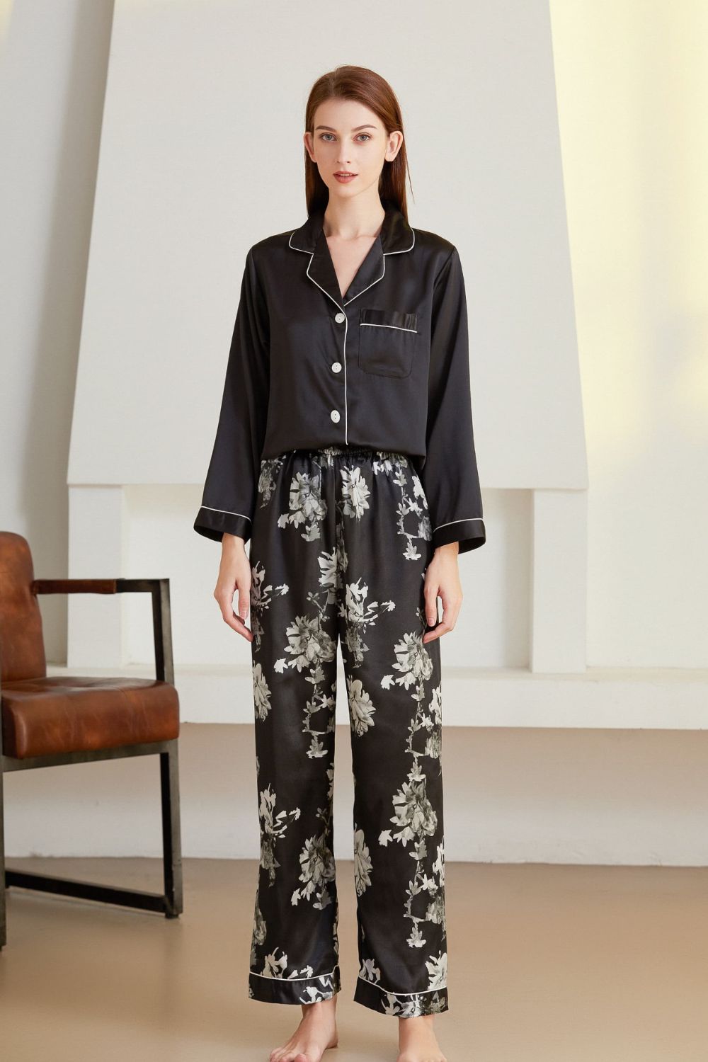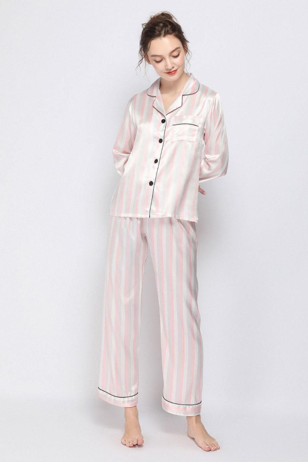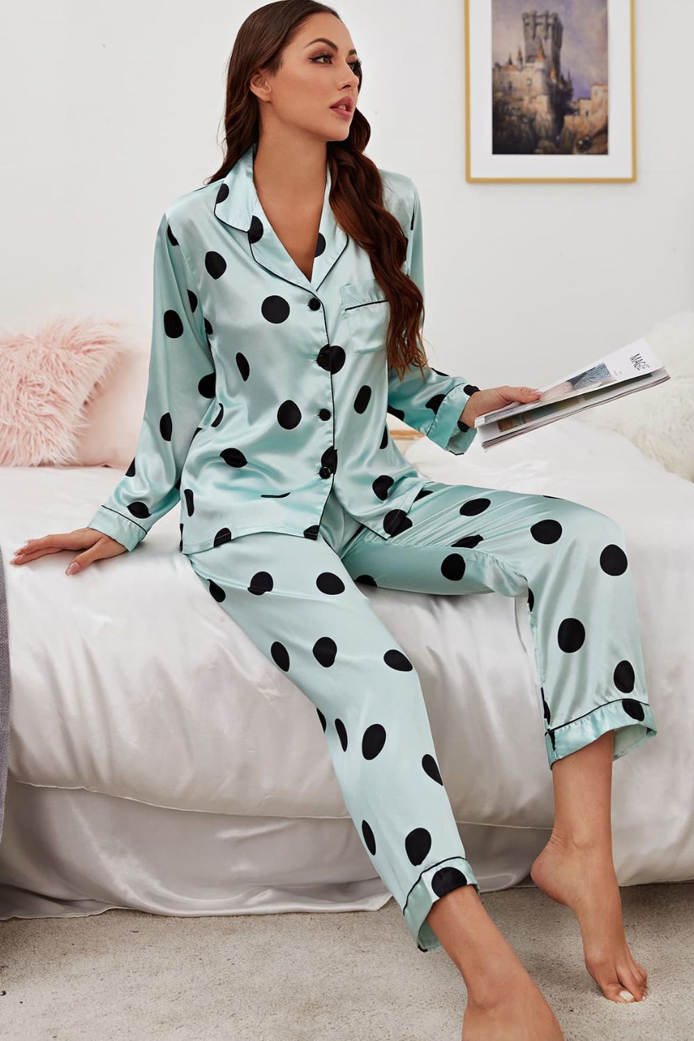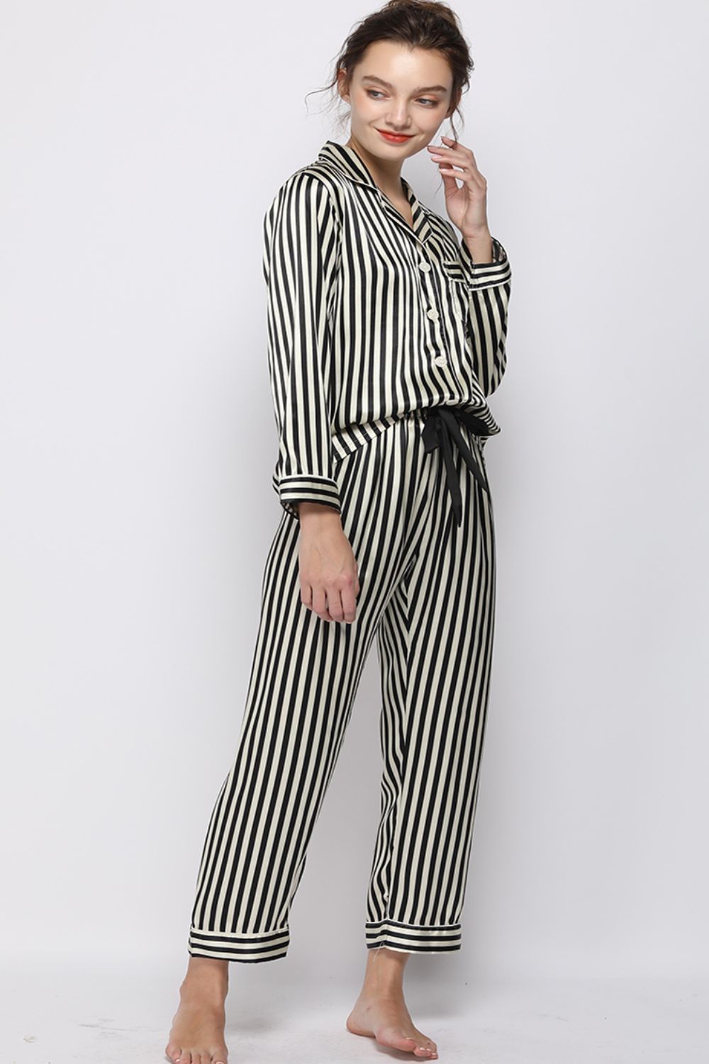 Satin Button-Up Lapel Collar Top and Pants Pajama Set