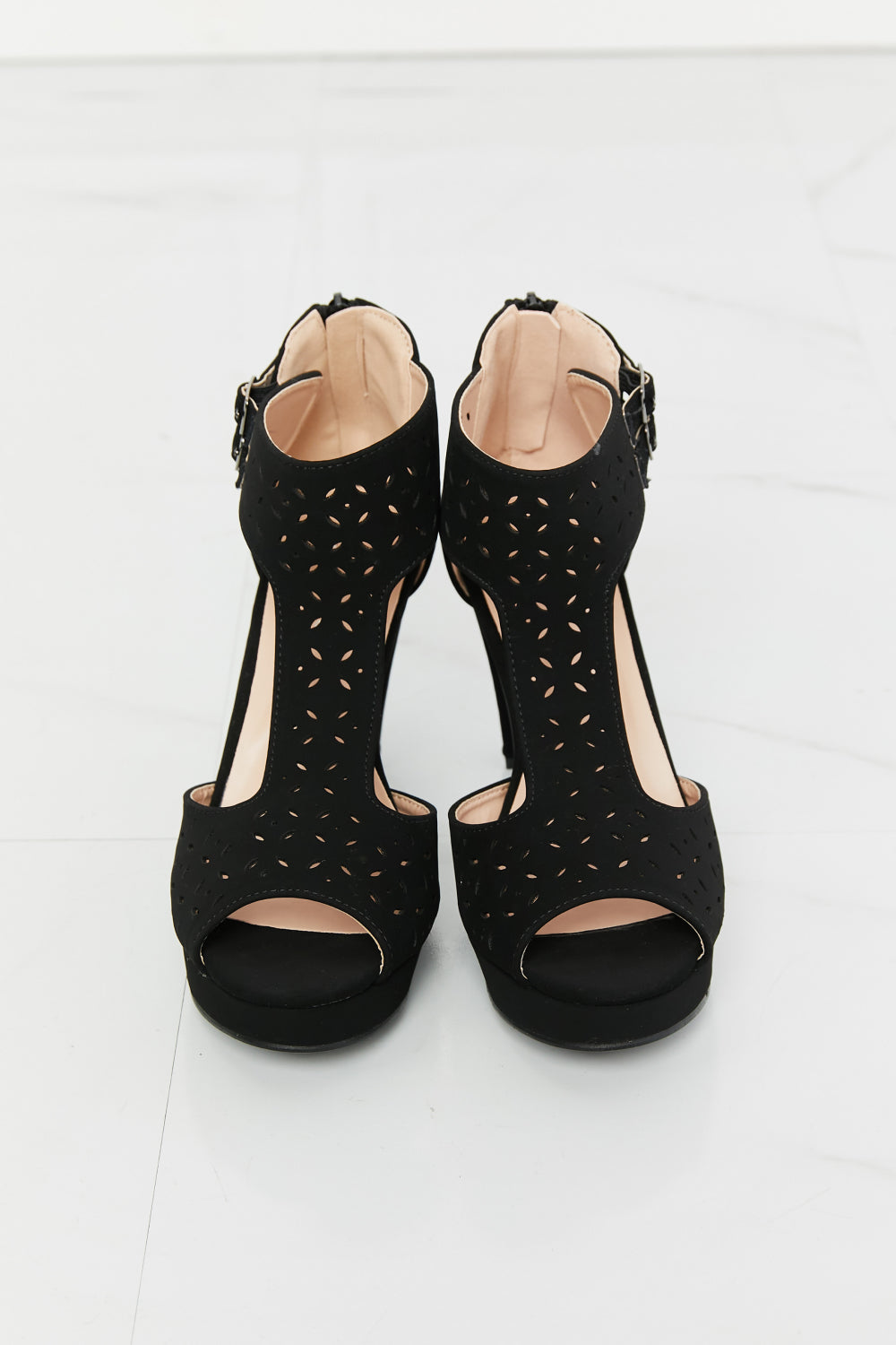 Our stunning peep toe t-strap heels are crafted from premium materials, ensuring durability, and the 3.5 inch heel boosts your height without compromising on comfort. The t-strap design elegantly wraps around your ankle, providing a secure fit and a touch of glamour, and the laser cut design adds a fun touch to these must-have shoes.