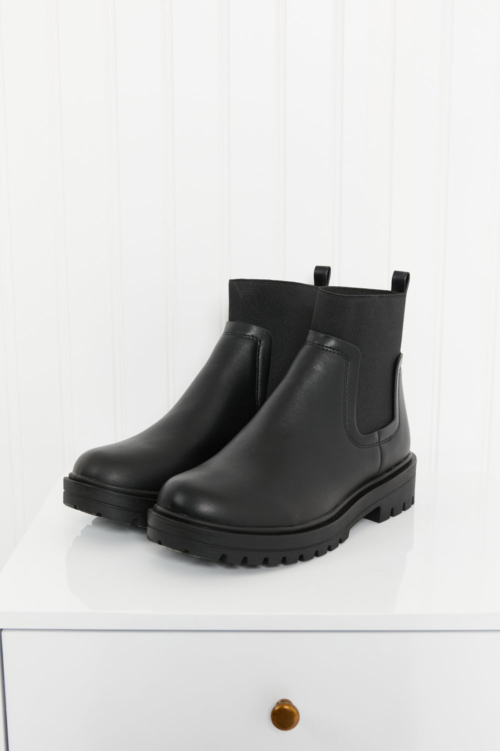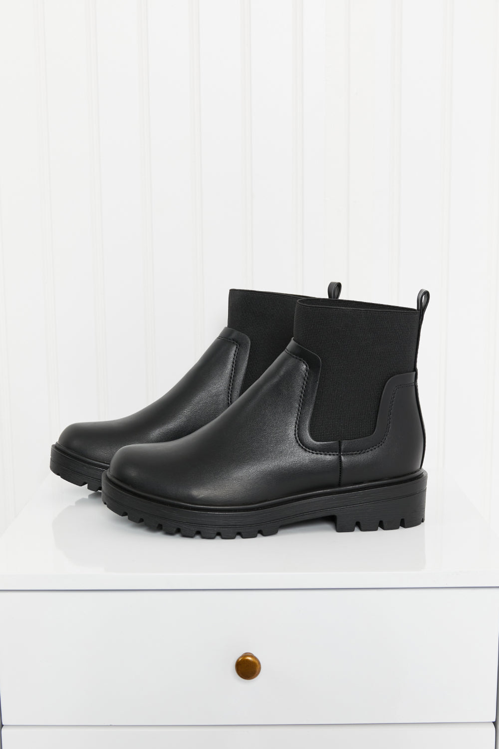 Thick-soled and made with vegan leather, these ankle booties make a statement on their own. The tight sock-like banding around the ankle keeps these in place and adds a unique detail, while the rounded toe makes these easy to dress up or down.
