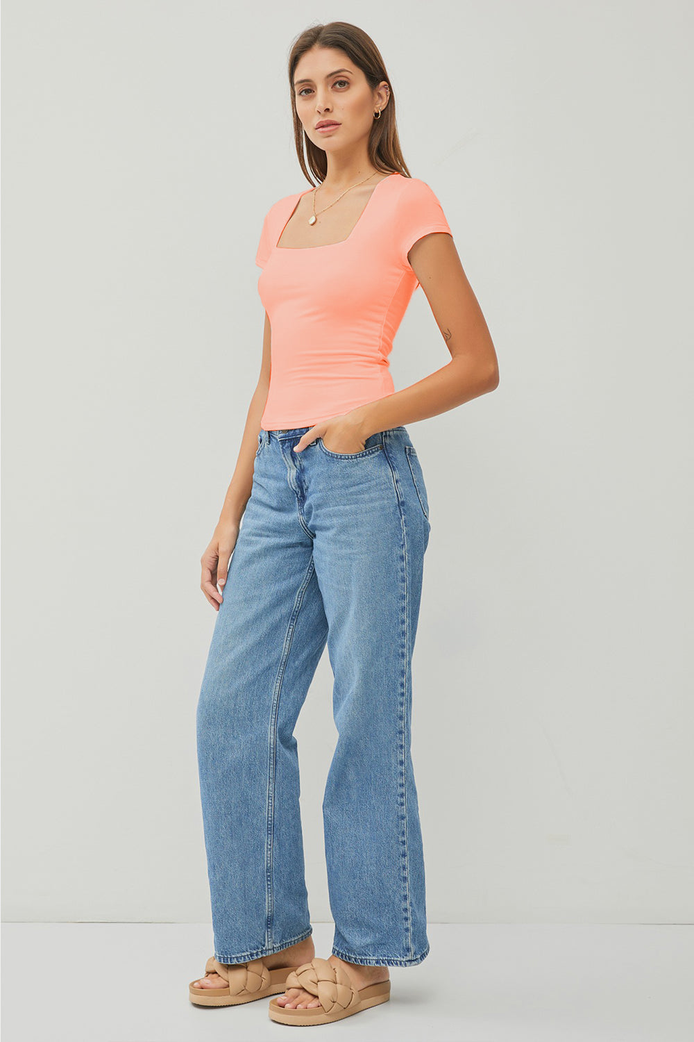 The Square Neck Short Sleeve T-Shirt is a versatile and trendy piece that belongs in every wardrobe. The square neckline adds a stylish and modern touch to this classic silhouette. With its short sleeves, this t-shirt is perfect for layering or wearing on its own during warmer months. Crafted from quality materials, the shirt offers both comfort and style for everyday wear. Pair it with jeans for a casual look or dress it up with a skirt for a more polished outfit. Upgrade your collection with the Square Neck Short Sleeve T-Shirt for effortless chic style.