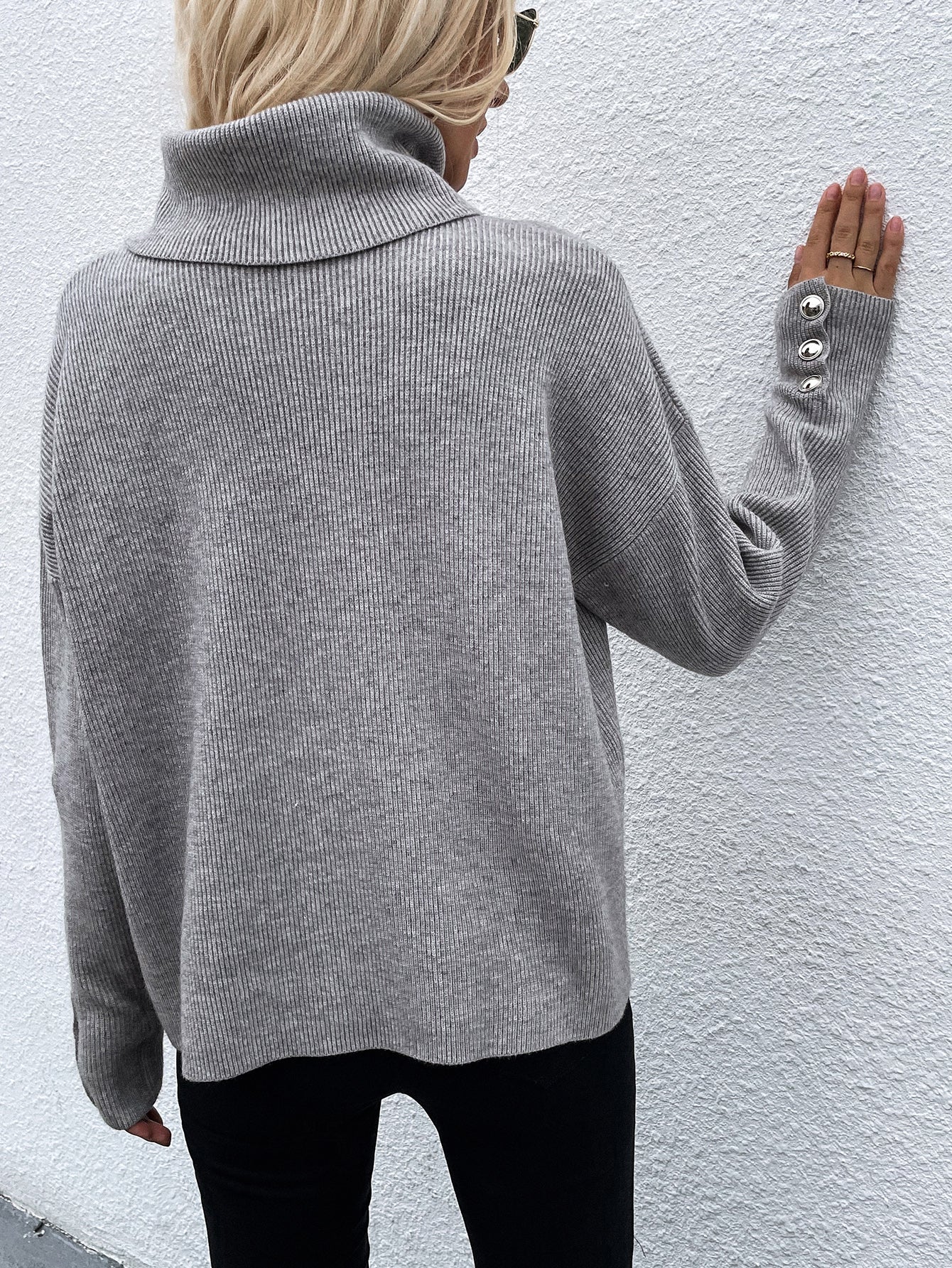 - Features: Button cuff, rib-knit