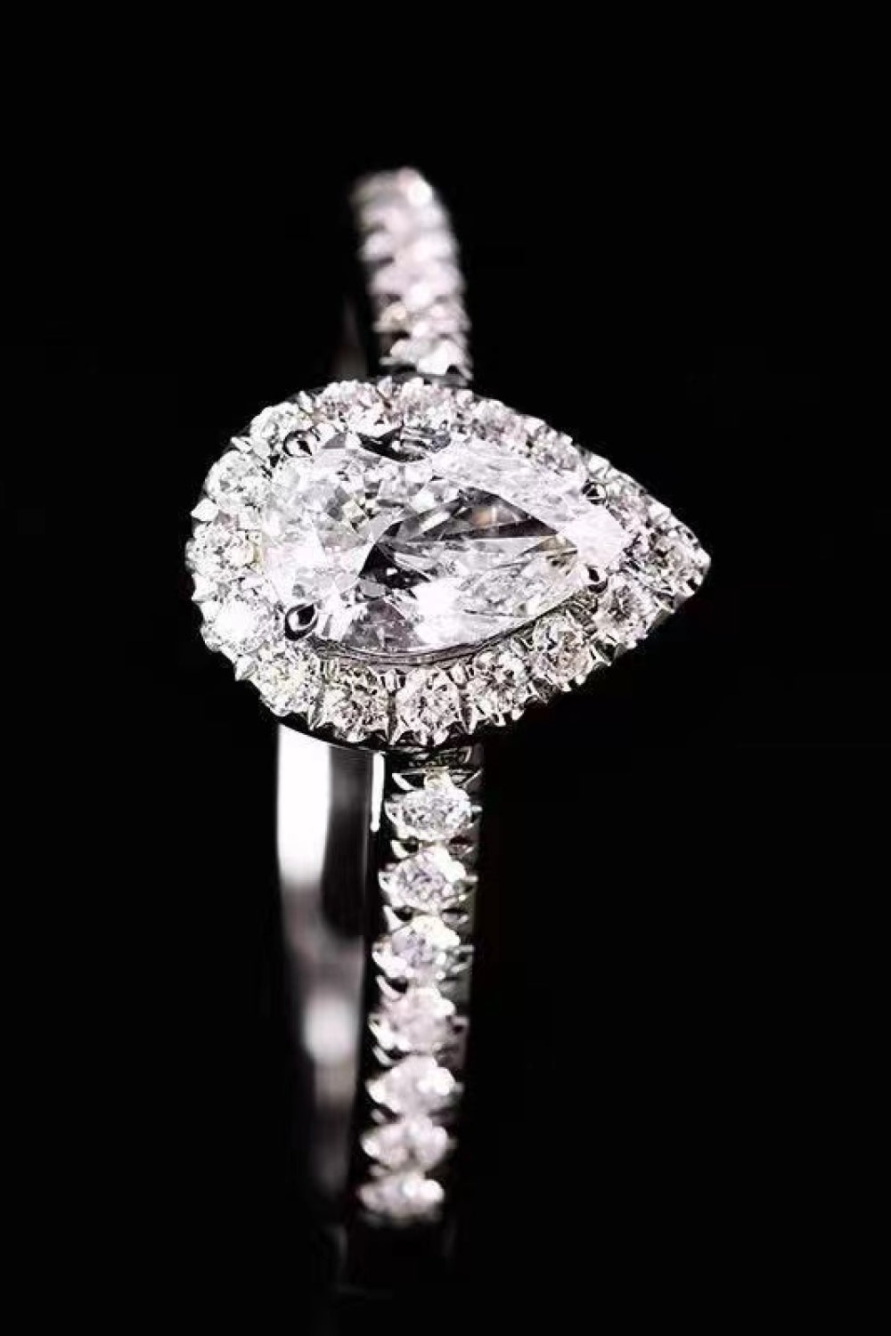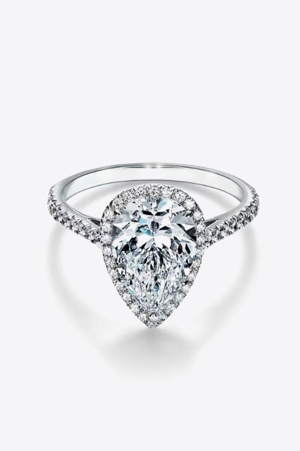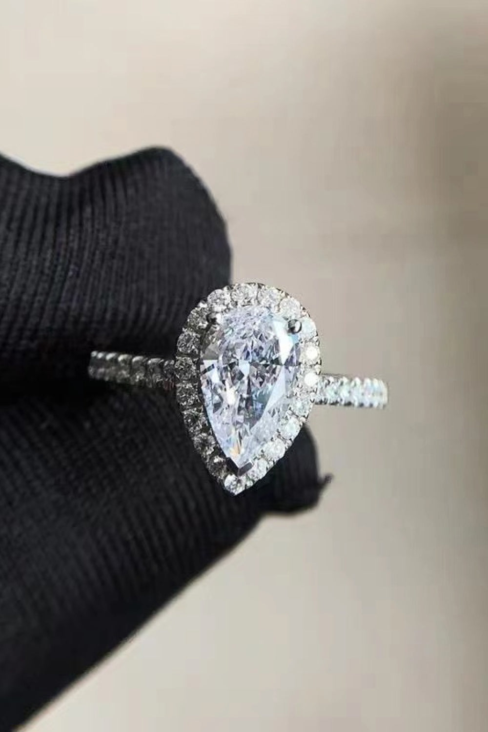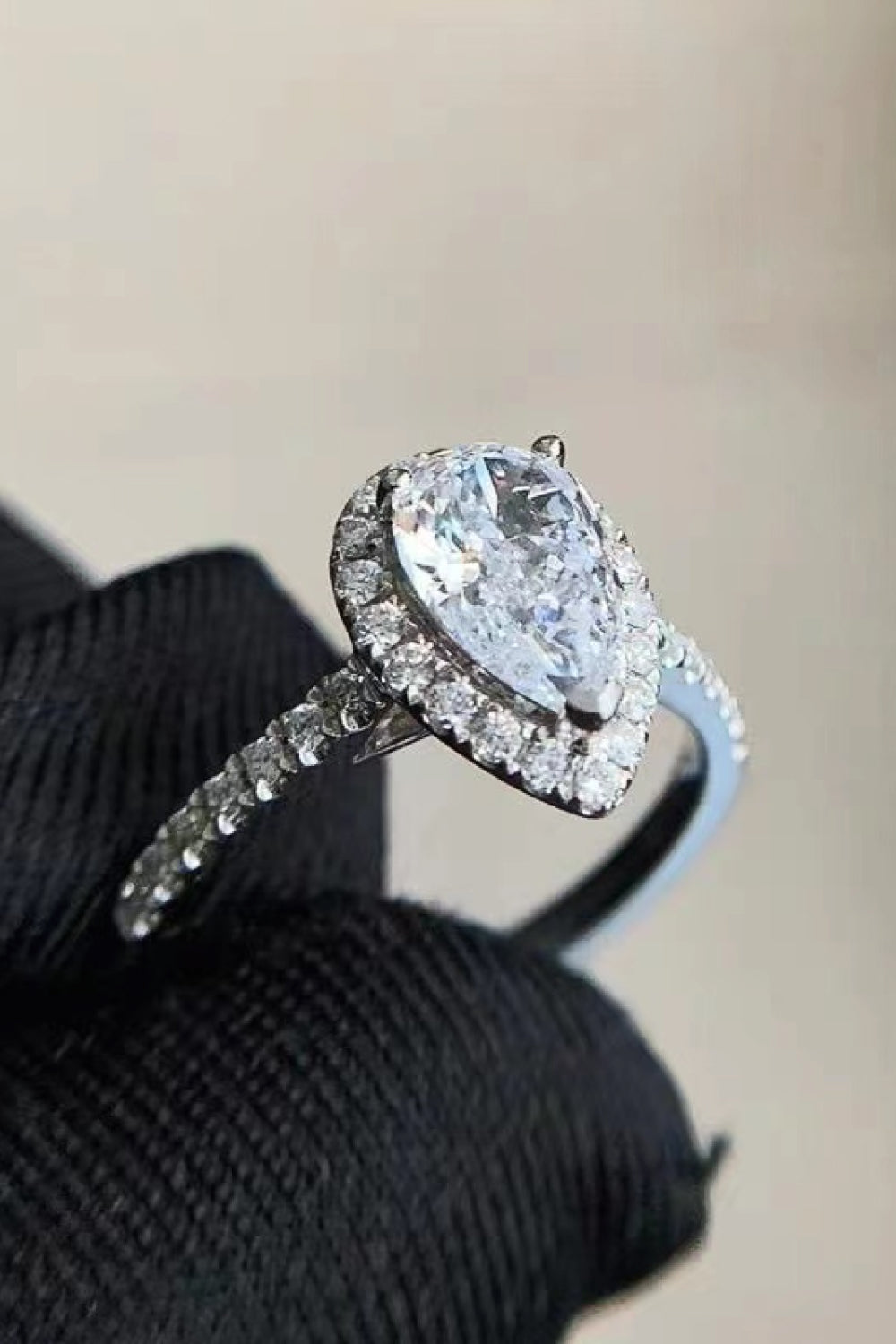 A gorgeous teardrop shaped 2 carat Moissanite teardrop cluster ring. The high-quality moissanite stone gives off that warm sparkle and shine, creating a beautiful sparkle.