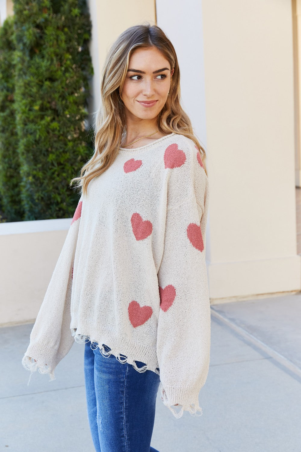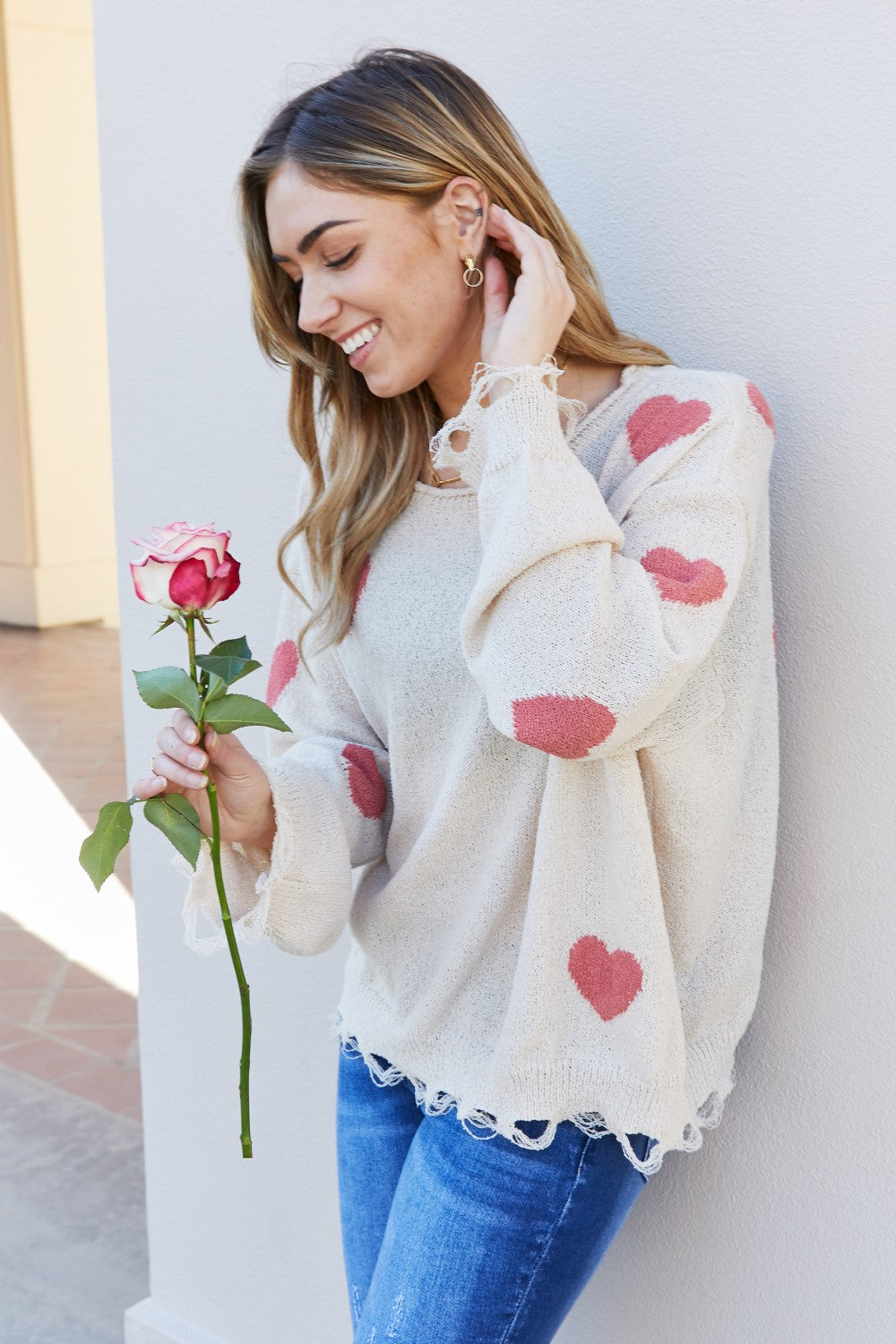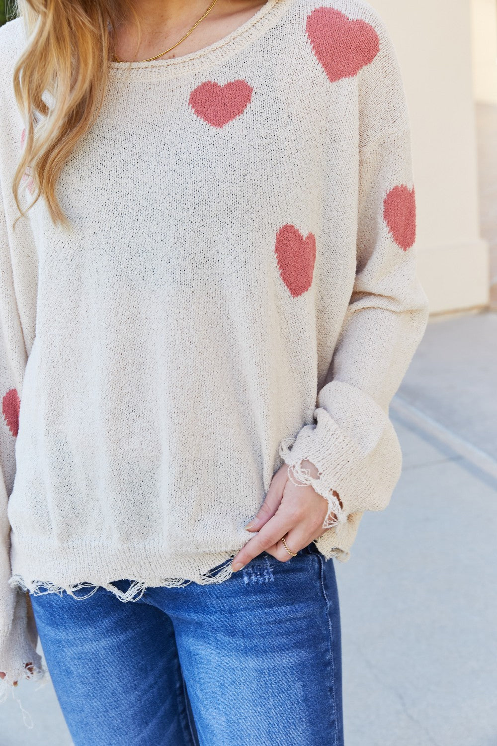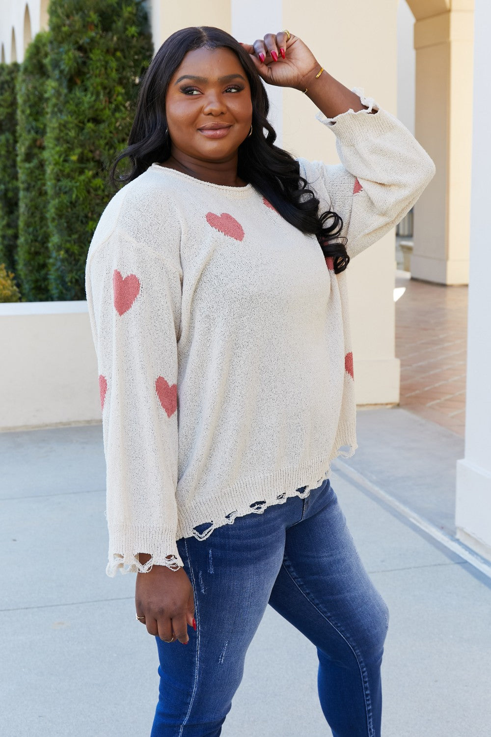 ADORA Full Size Heart Round Neck Distressed Sweater
