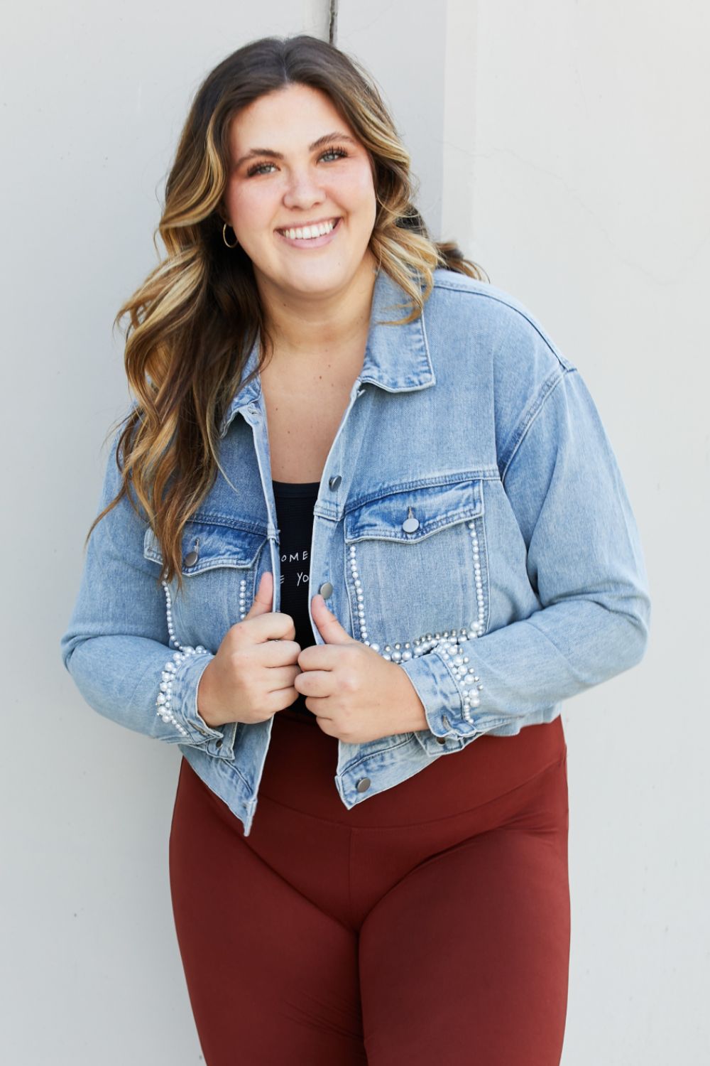 Add a little glamour to your casual wardrobe in this cropped denim jacket. This trendy piece features pearl accents, dropped shoulders, and front pockets for even more details. Perfect for date nights or grab-and-go day looks.