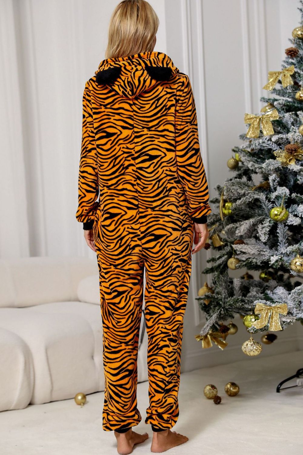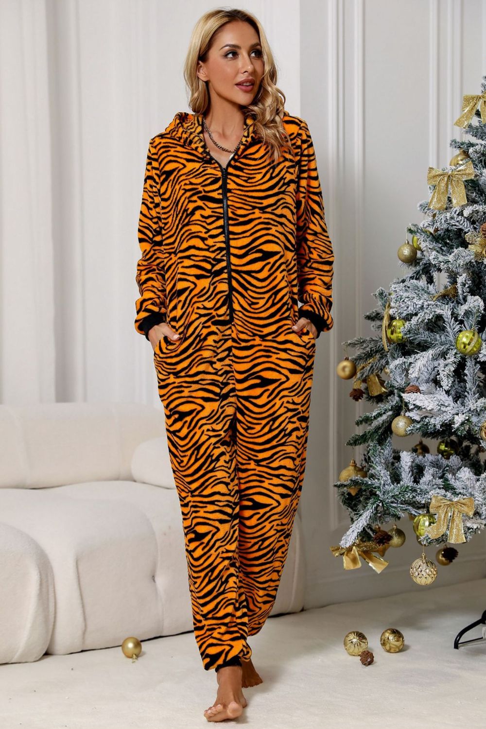 Animal Print Zip-Up Hooded Flannel Jumpsuit with Pockets