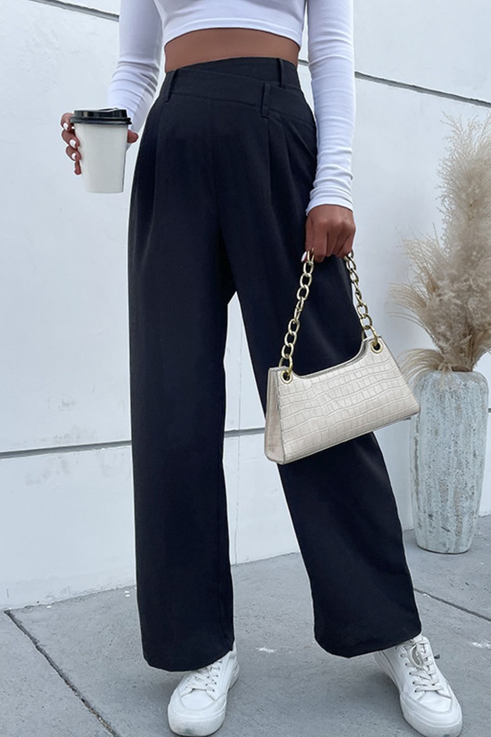 Asymmetrical Pleated Waist Wide Leg Pants