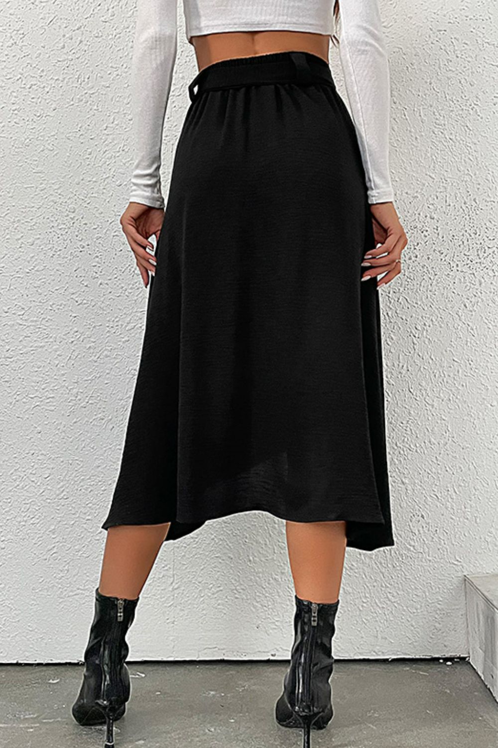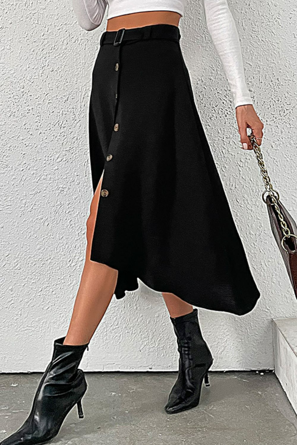 - Features: Belted, buttoned