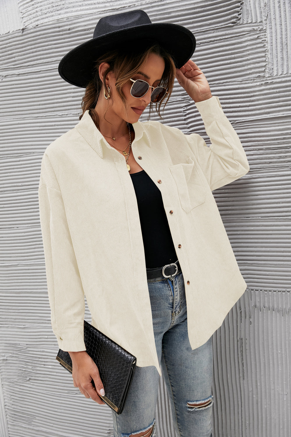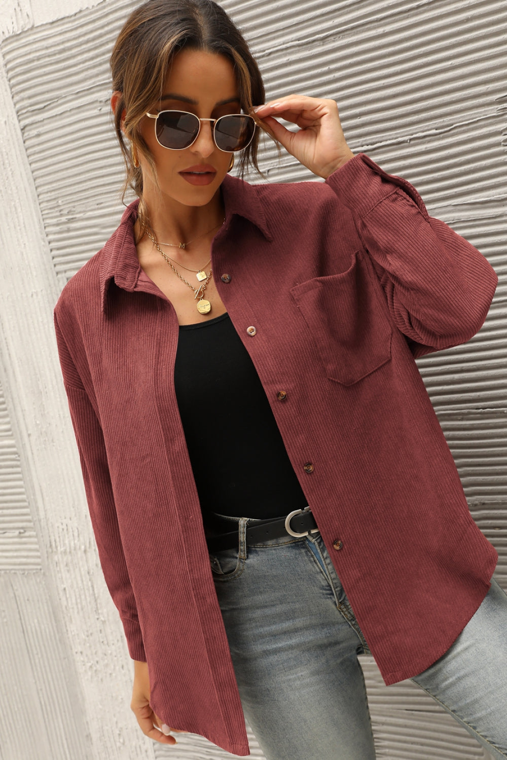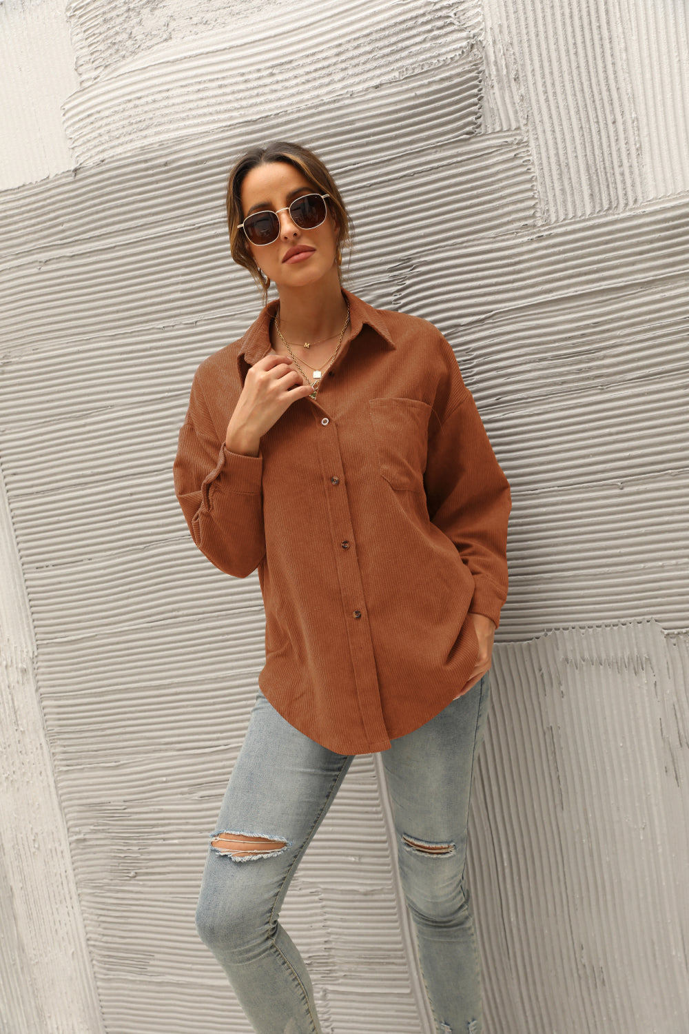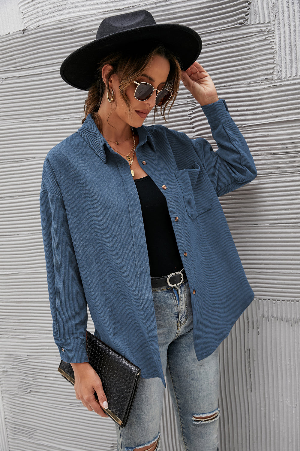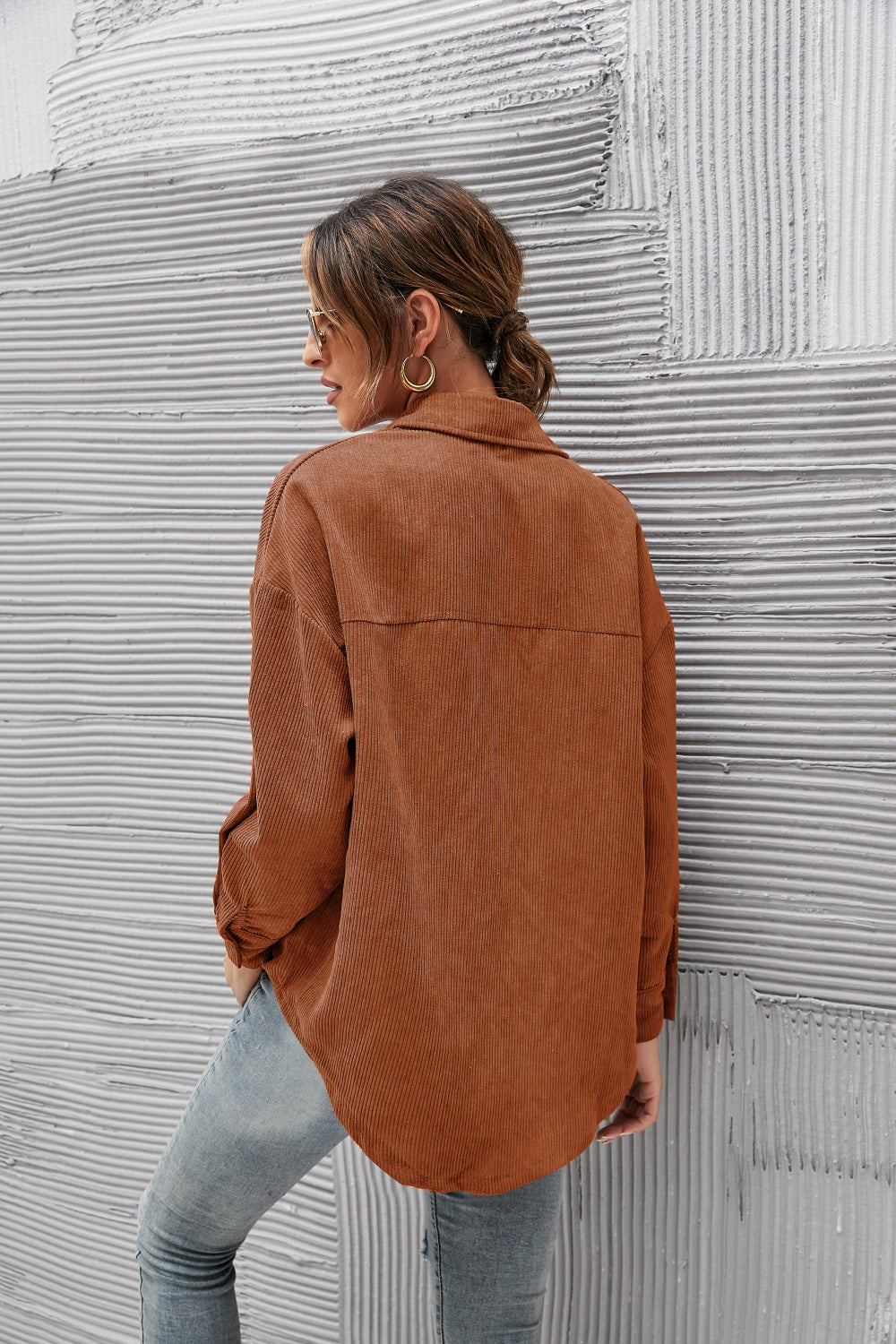 - Features: Long sleeve, drop shoulder, button front, pocket, curved hem, corduroy
