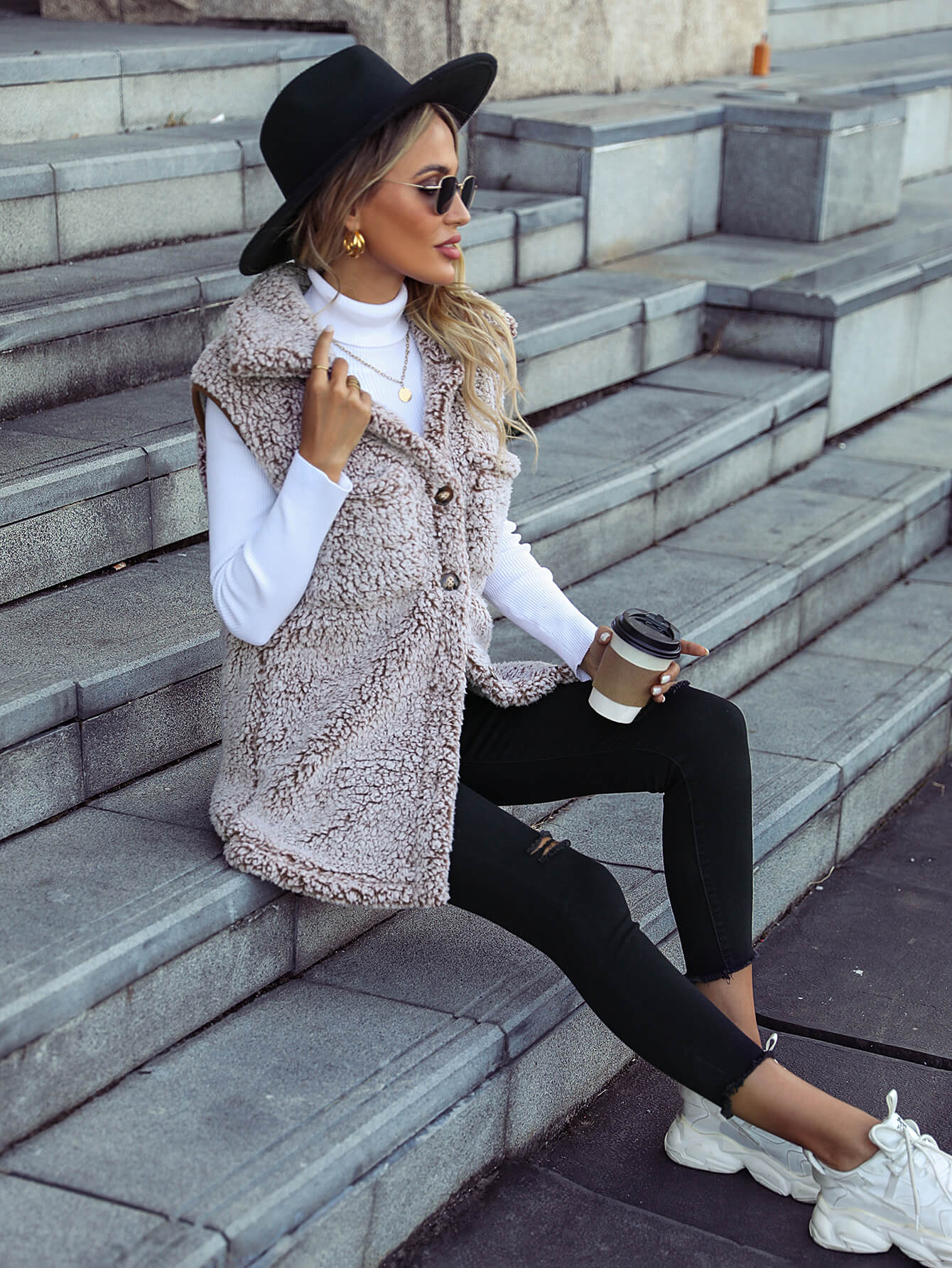 Keep warm and look great this season with the Collared Neck Teddy Vest! This vest features a sleeveless design, a collared neckline, a long length, and pockets. It is made of a slightly stretchy material that is comfortable and easy to wear.
