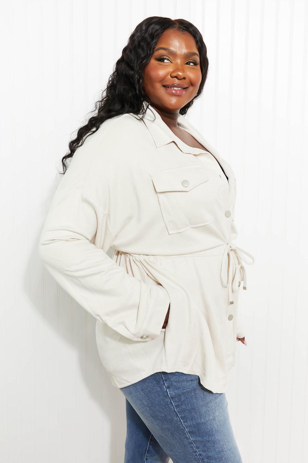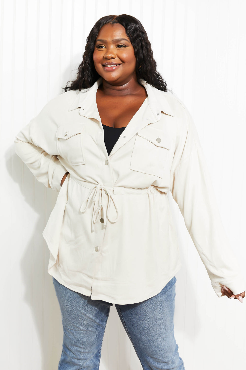 The classic shacket gets a new look with this piece from Cotton Bleu. With a curved hem, dramatic oversized and longline fit, and a faux suede fabrication, this shacket is already a winner. But that's not all -- it also has a tie at the waist which can be tightened according to your preferences, and side and breast pockets for ultimate function.