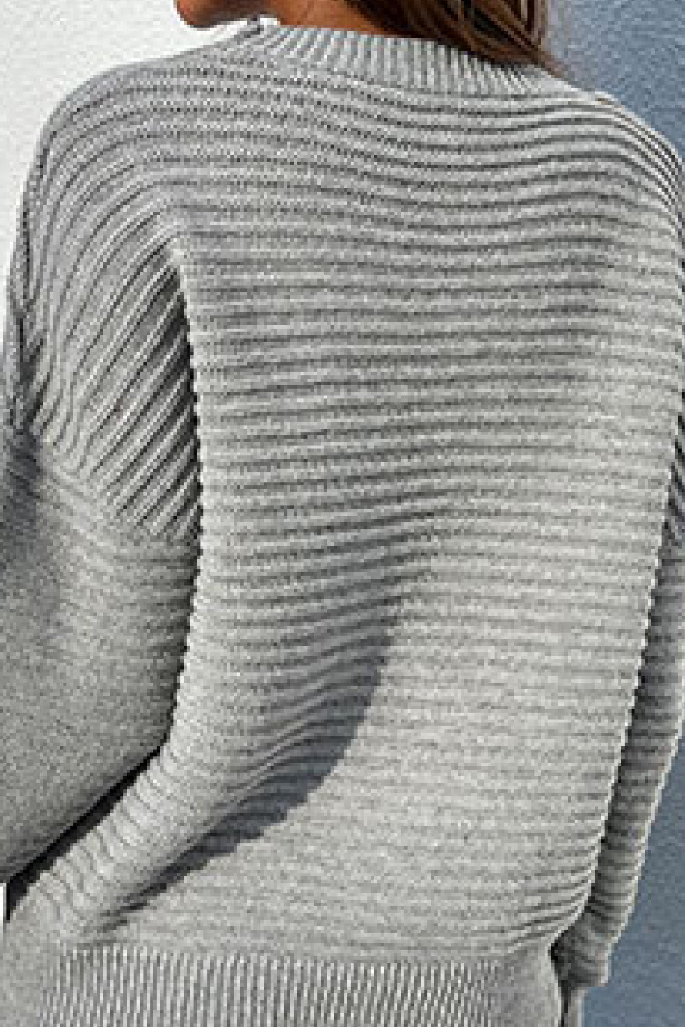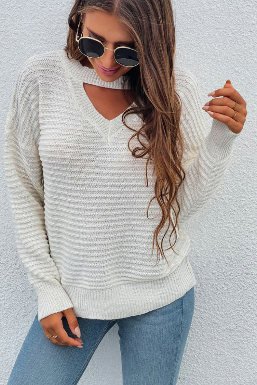 - Features: Horizontal rib-knit, cutout neck, ribbed trim