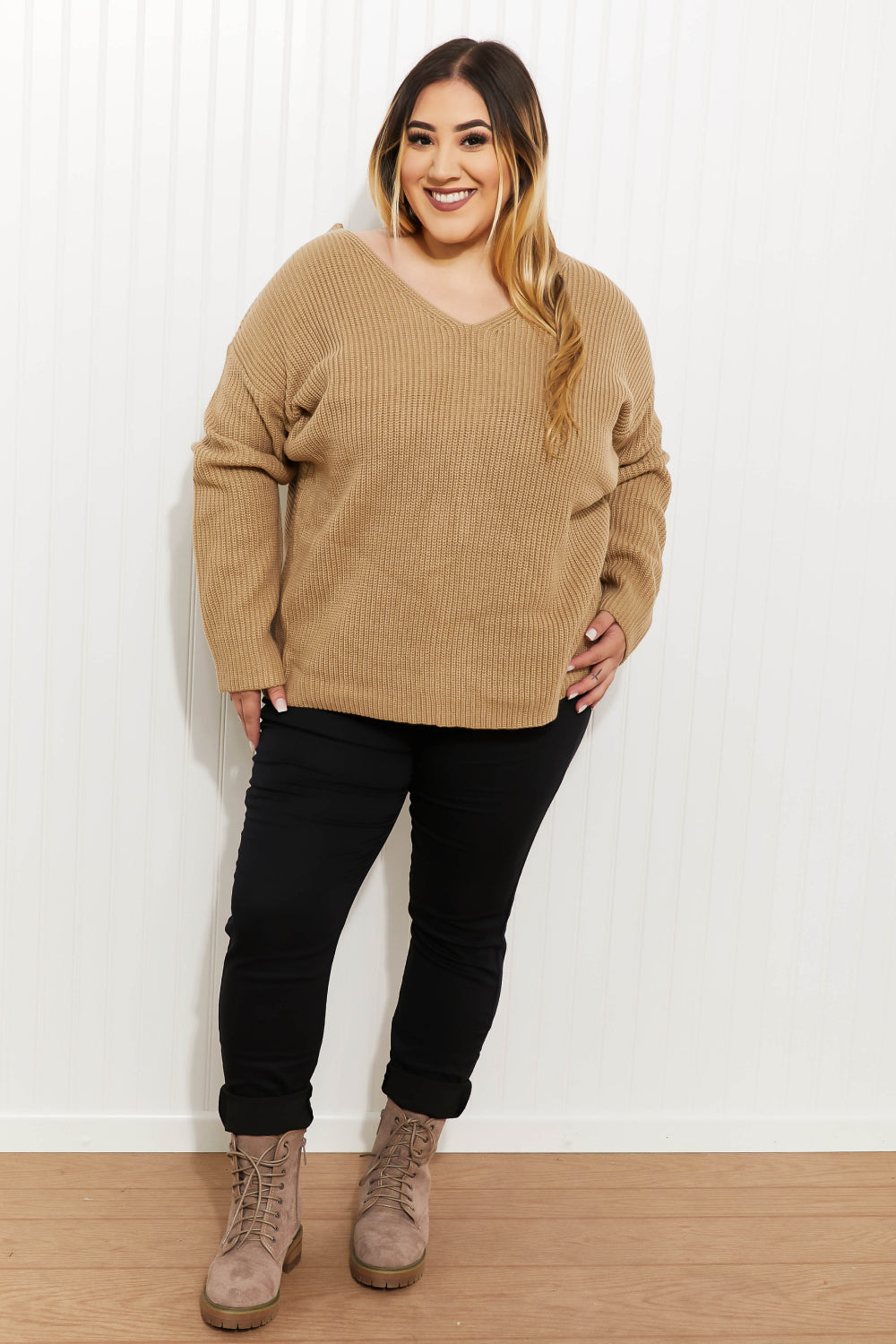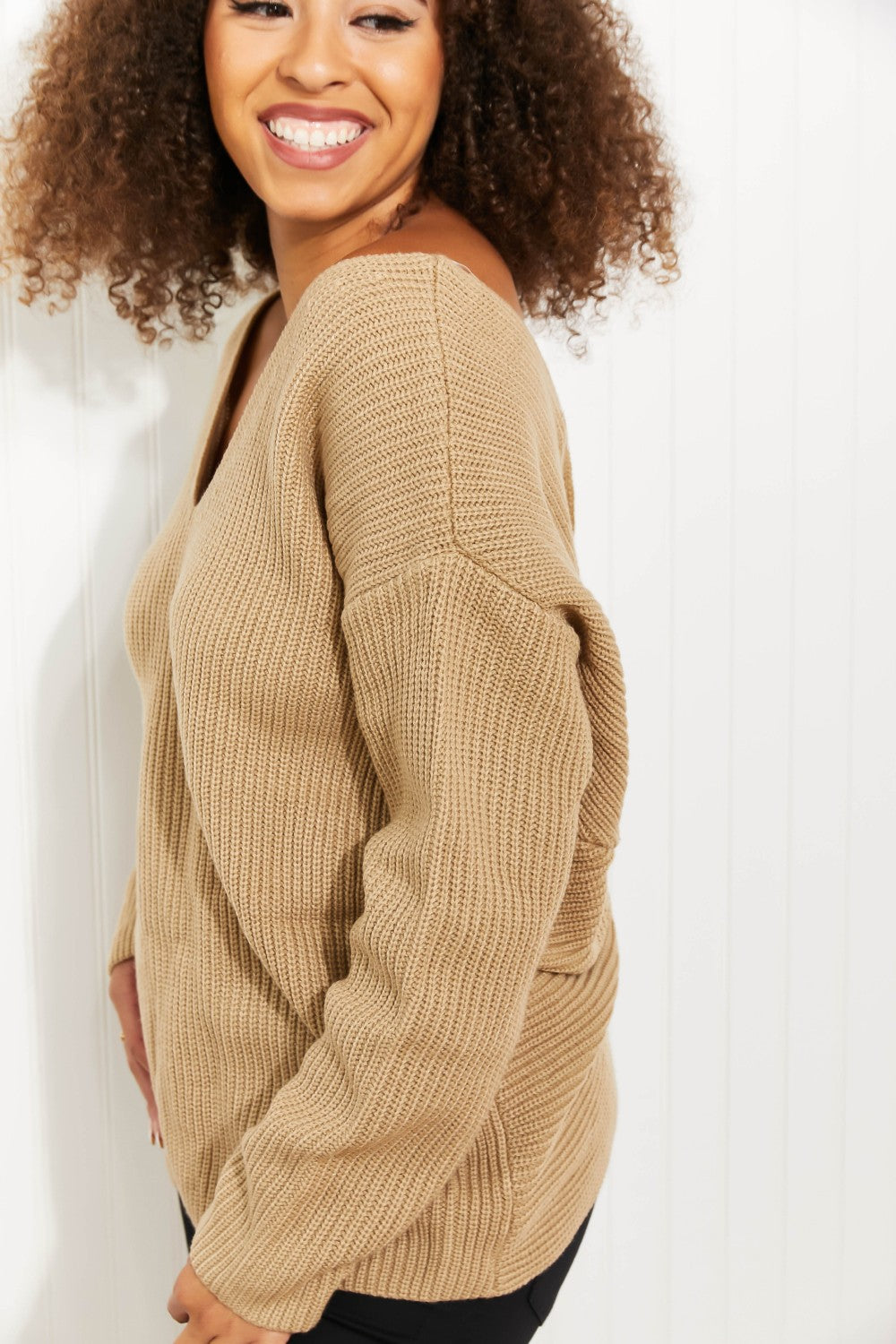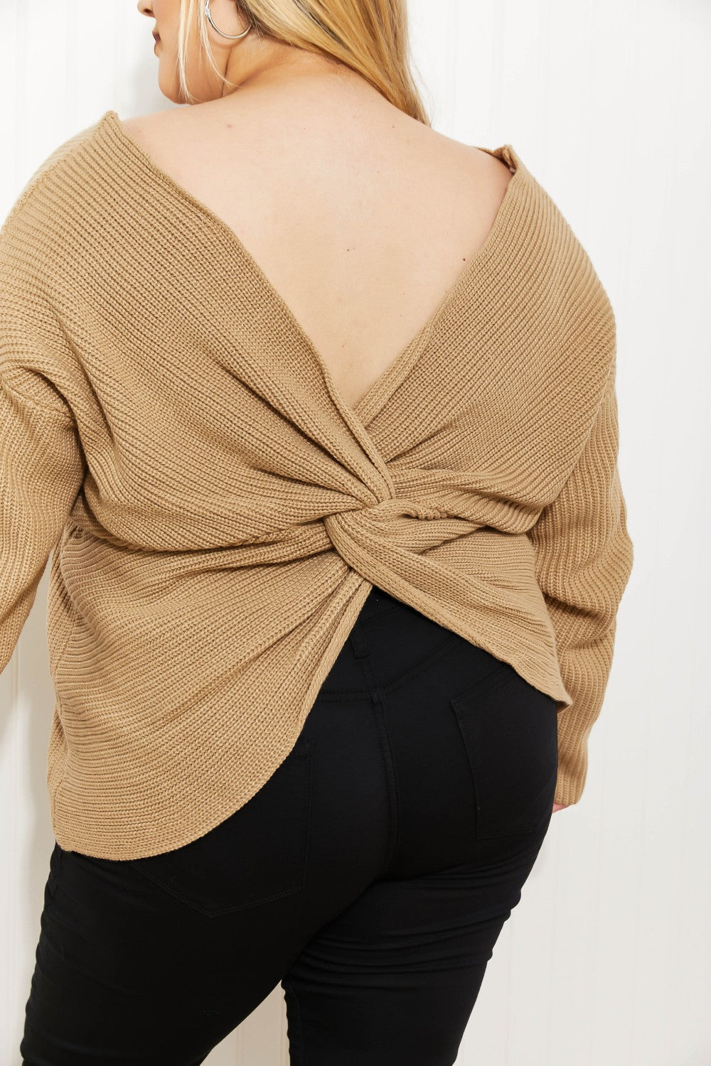 From the front, this sweater appears to be a classic v-neck design, but turn around, and you'll see that it has put a twist on that timeless design! A twisted open-back detail takes this sweater up a notch and turns it into a statement-making piece perfect for any occasion.