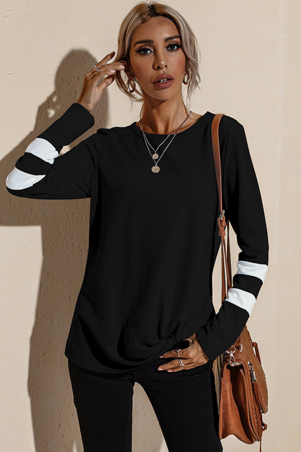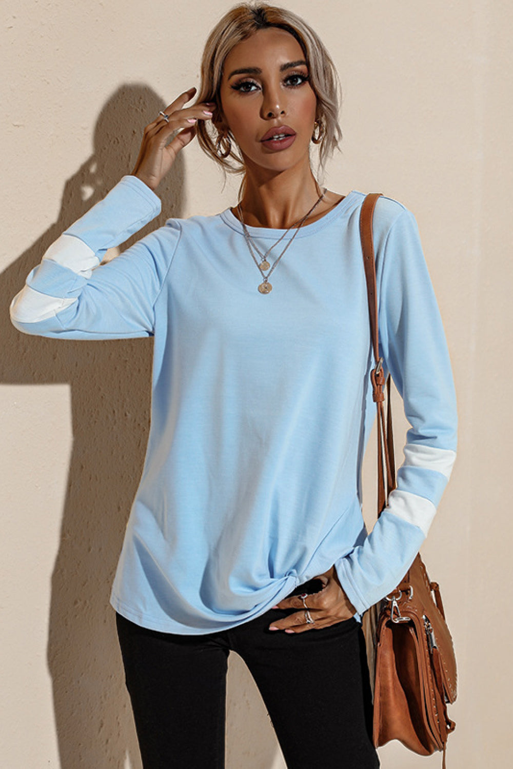 - Features: Long sleeves, twisted hem