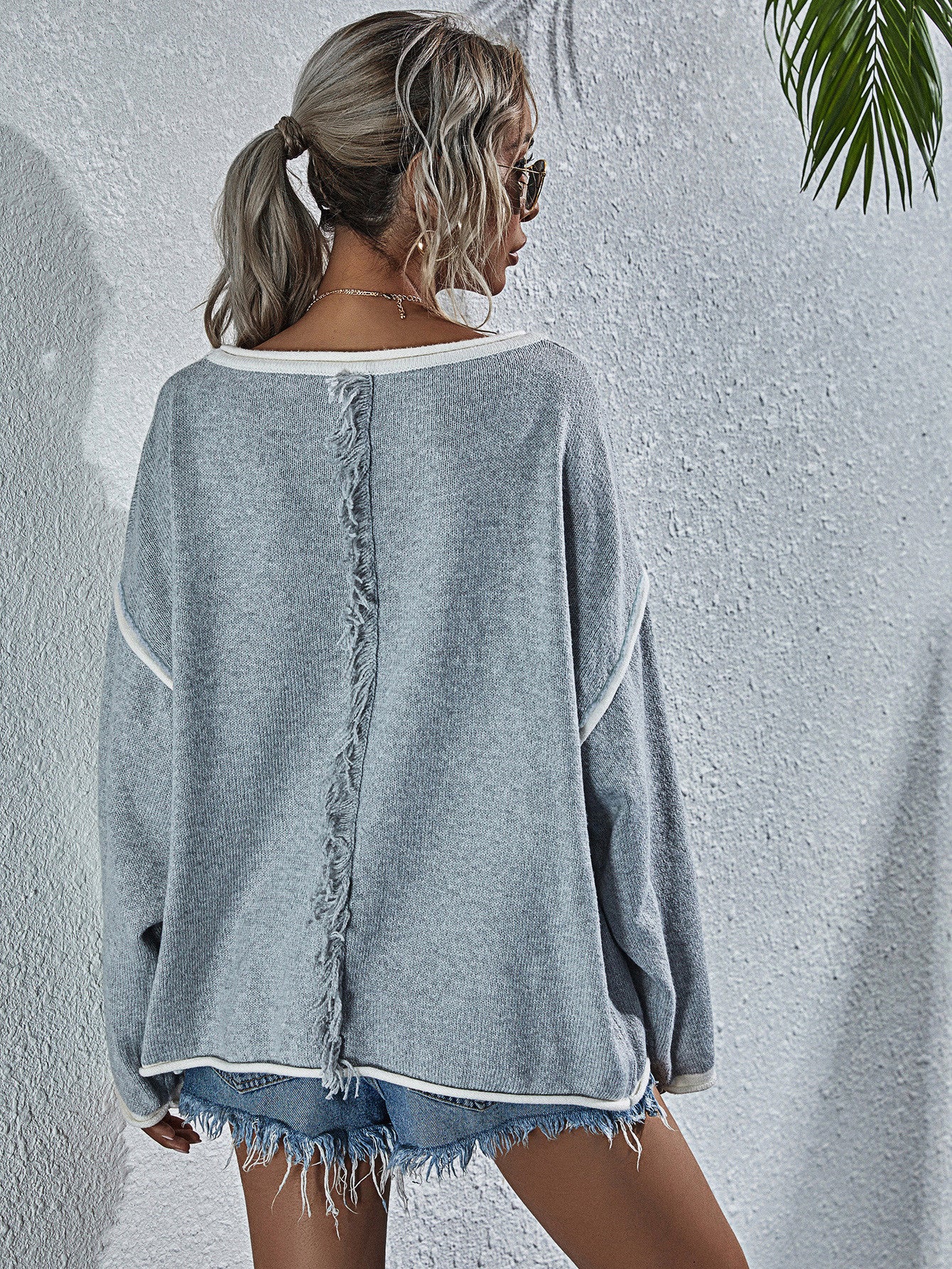 - Features: Long sleeves, dropped shoulders, exposed seams