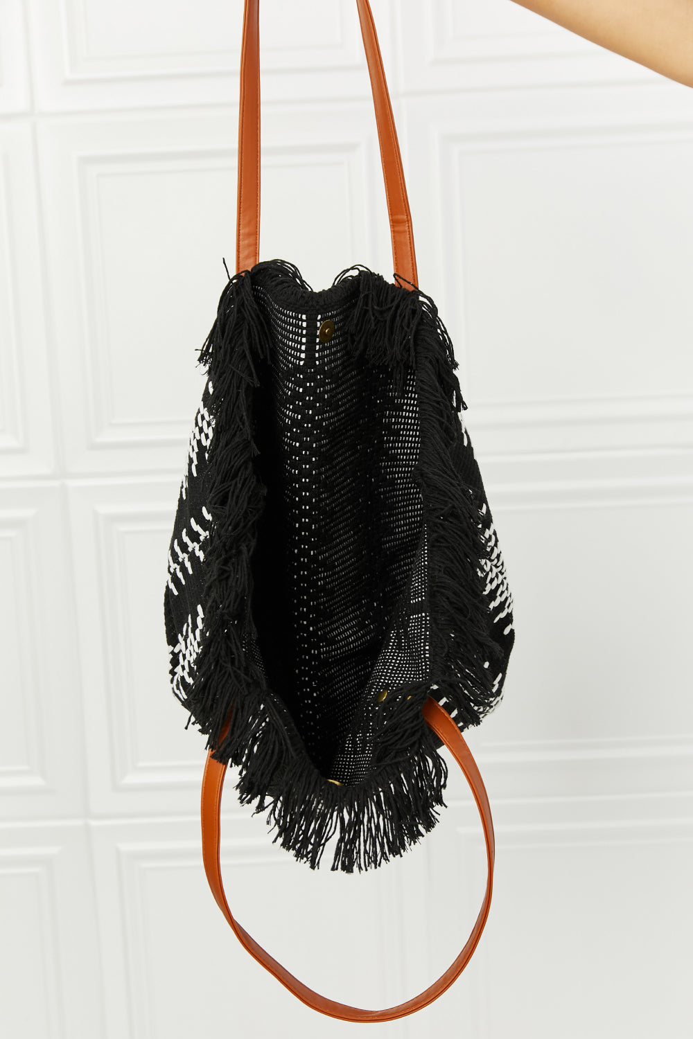 A classic tote made of a thick, weaved fabric material with a fringe detailing. The stitch detail is a hand emobroided detailing that adds contrast to the bag. This tote feature faux leather straps longenoug ht o wear as a shoulder bad and a magnetic button closure.