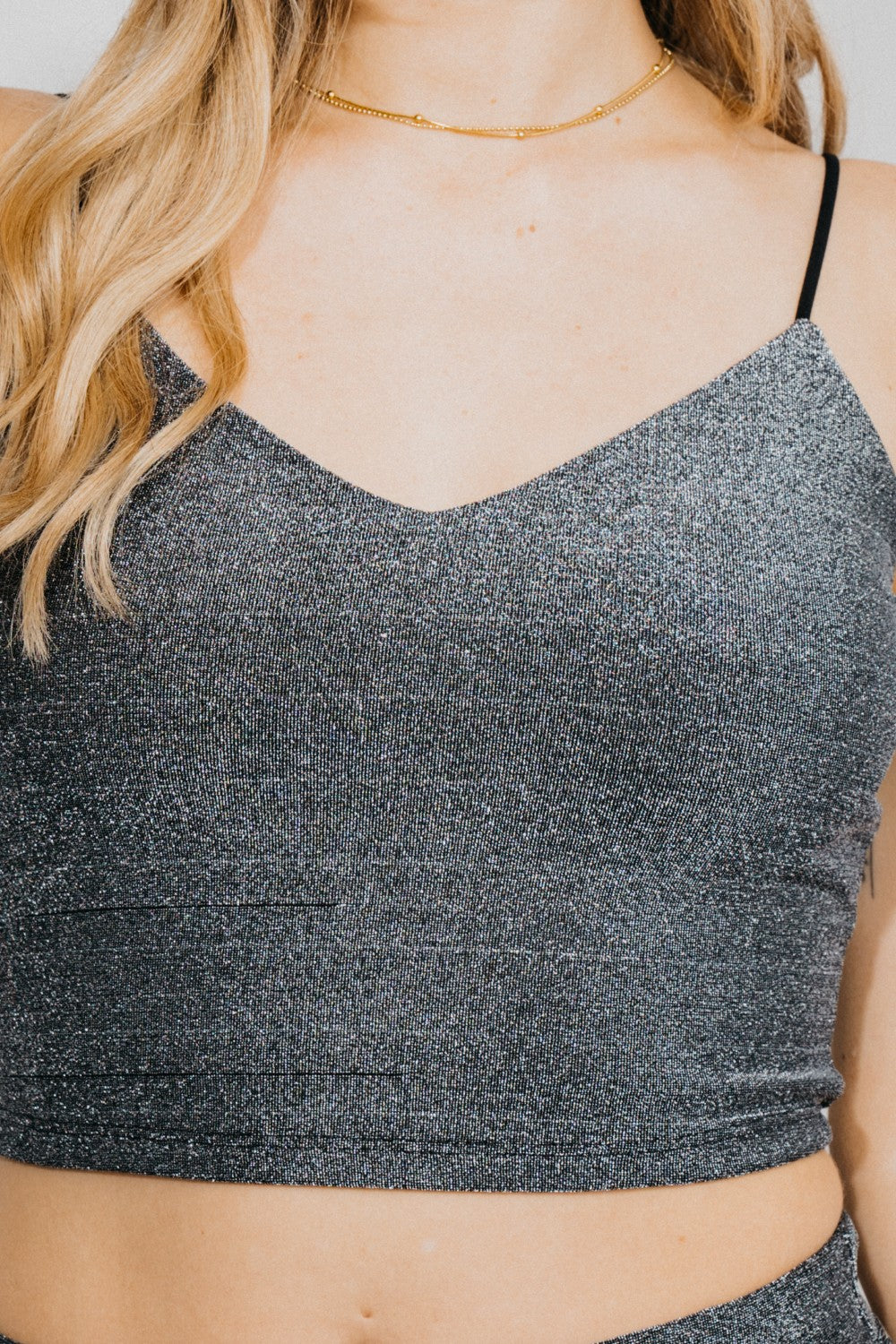 Elevate your look with this cropped cami, featuring a V-neckline and glitter detail. Pair with your favorite tank for a casual look, or dress up for a night out by wearing it under a blazer for extra sophistication.