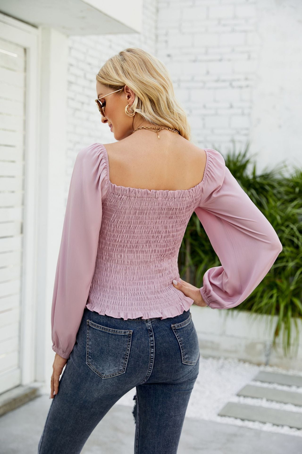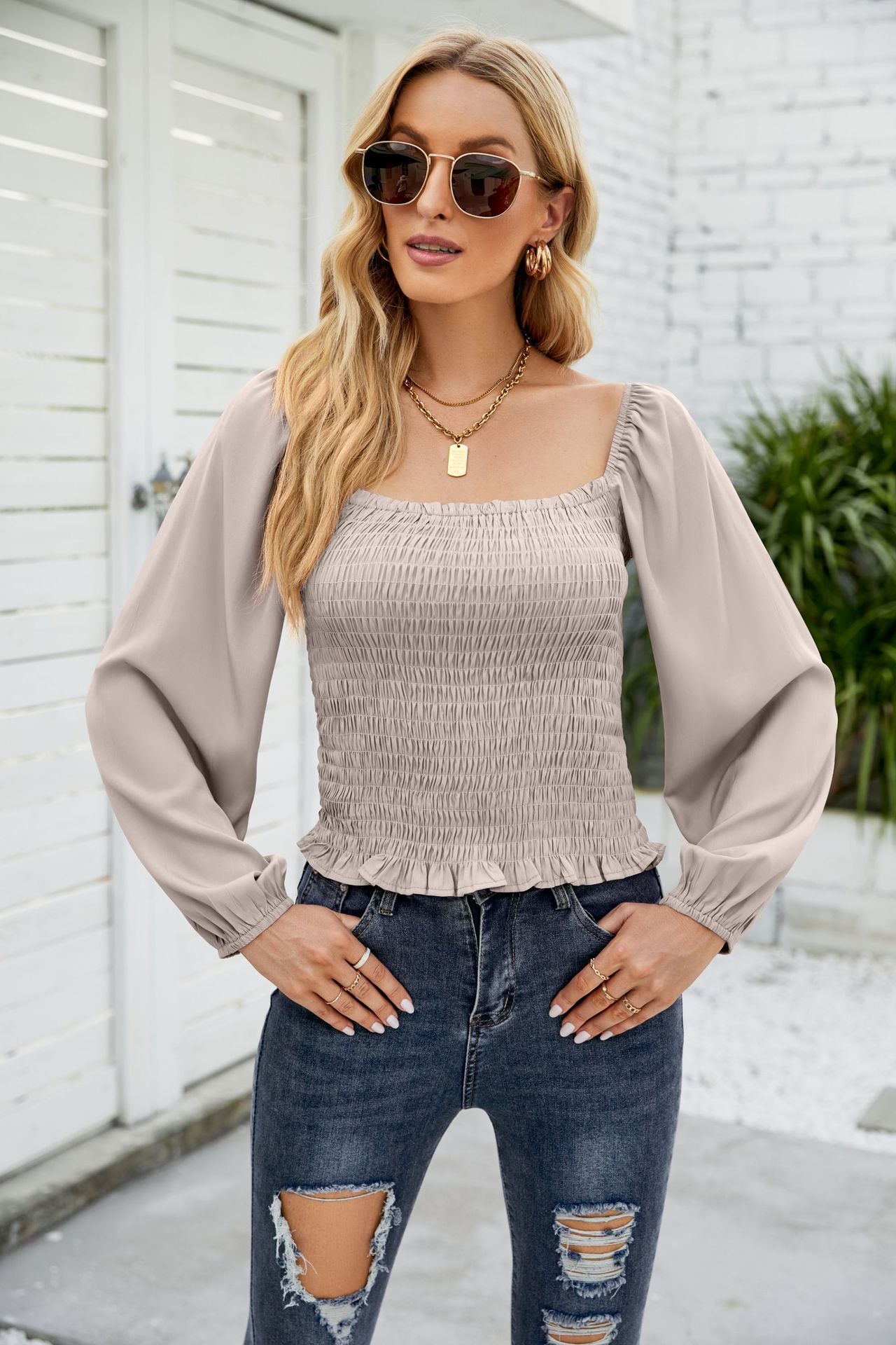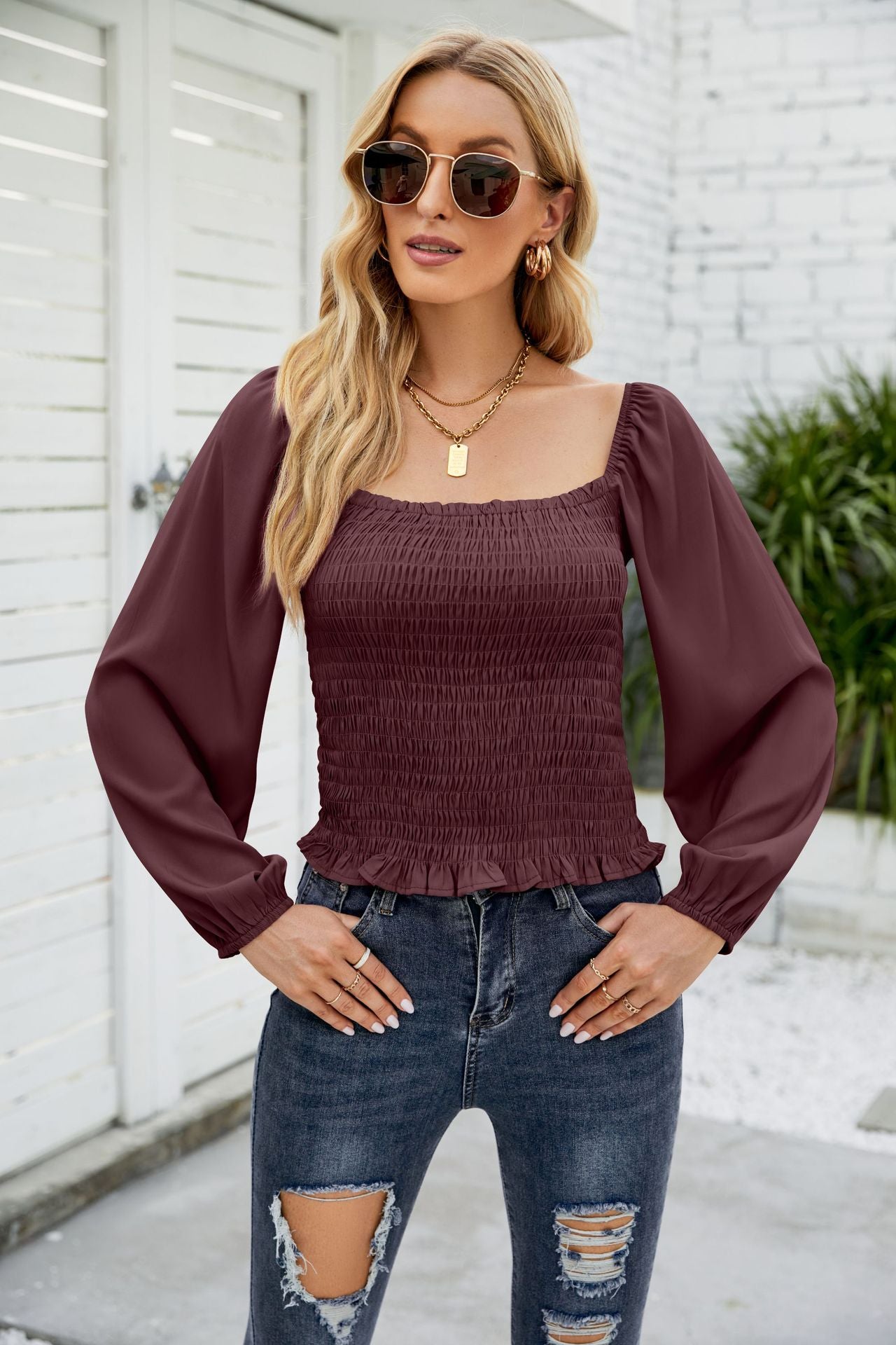 • Load image into Gallery viewer, Frill Hem Smocked Balloon Sleeve Blouse