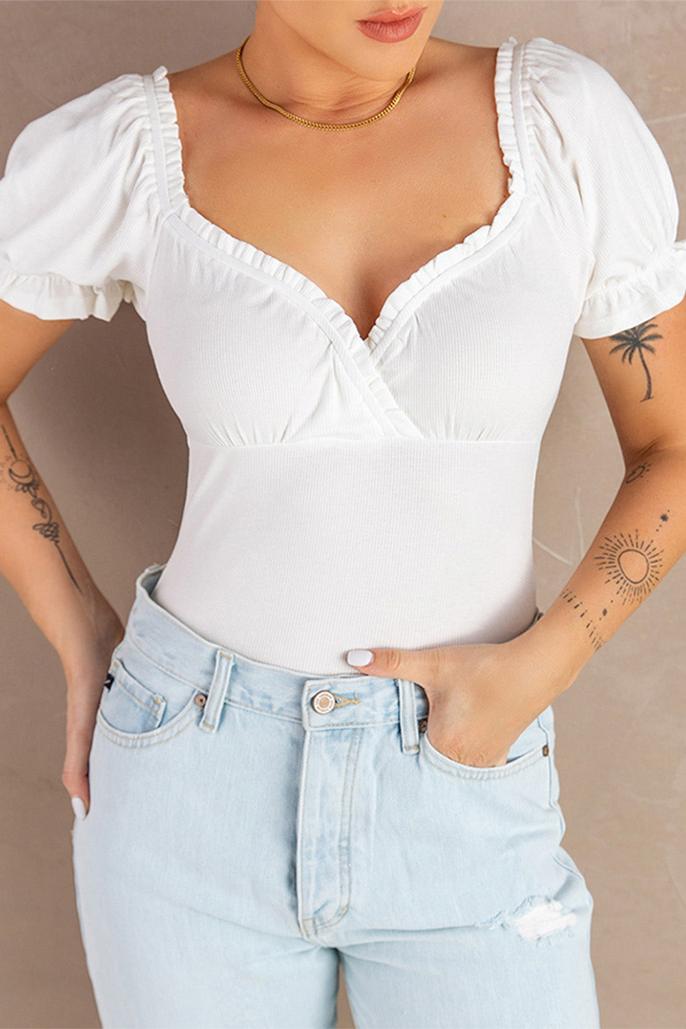 - Features: Puff sleeves, frill trim