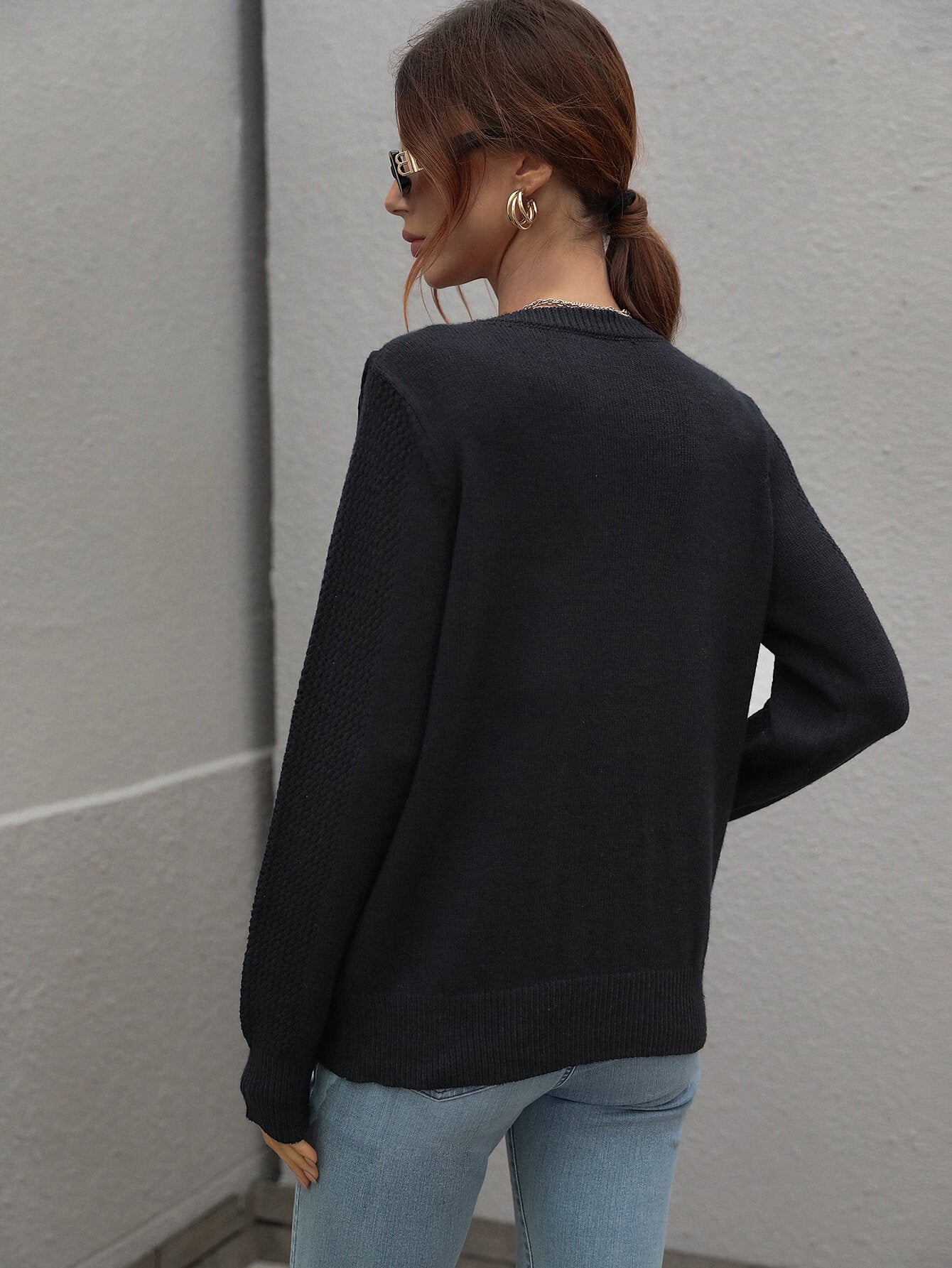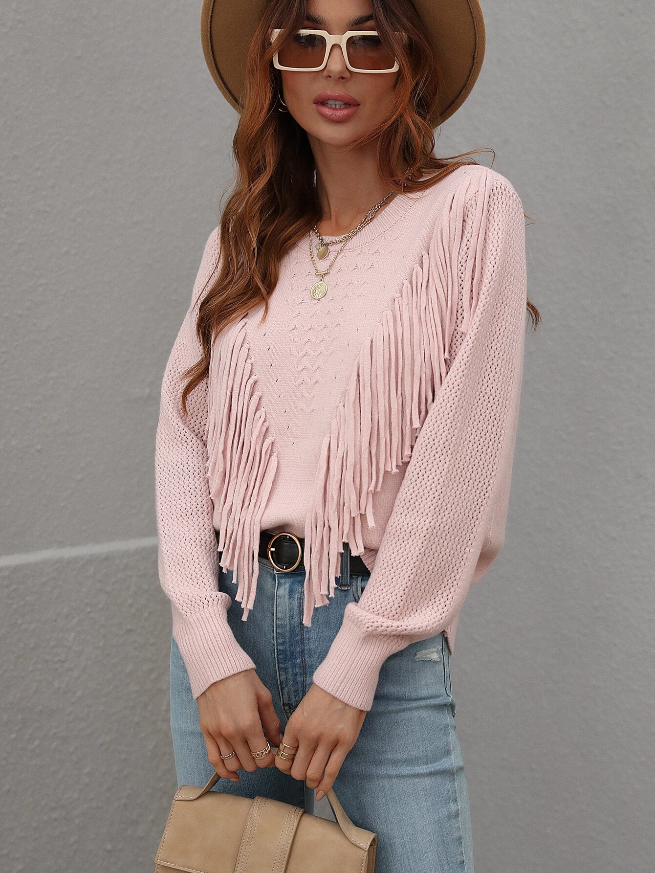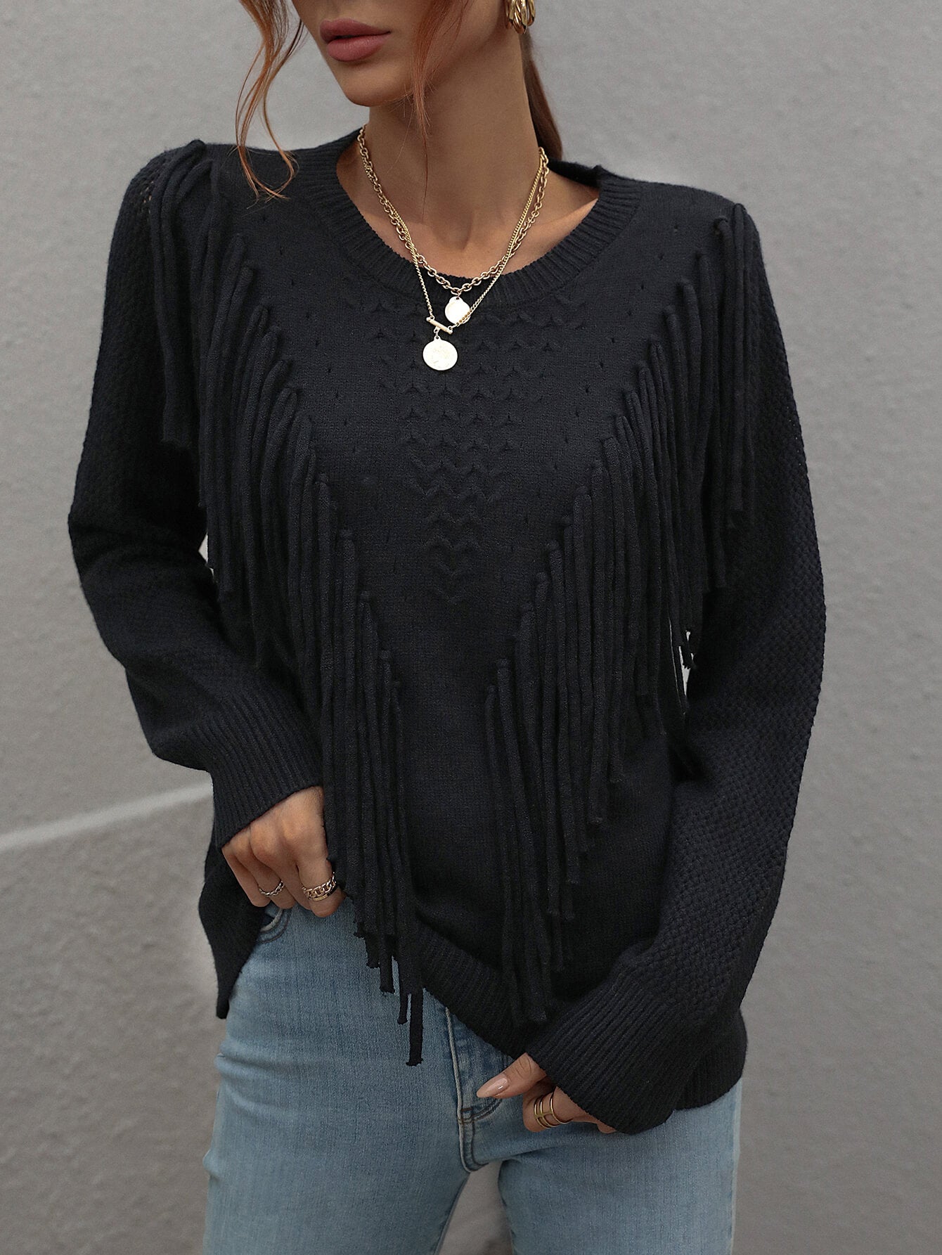 Our Fringe Detail Ribbed Trim Sweater is a perfect addition to your casual wardrobe this season. This sweater features a round neckline, fringe detailing, and long sleeves with ribbed cuffs for comfort. Add this stylish piece to your everyday wardrobe!