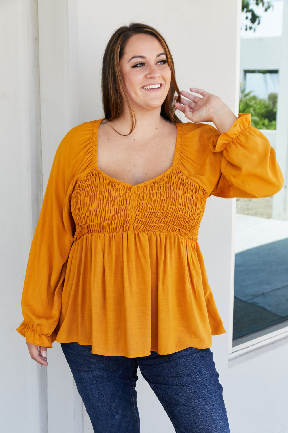 Smocked tops are flattering and trendy, and this one is no different. A relaxed fit changes up the standard smocked blouse look, and a flowy babydoll silhouette makes this easy to style. We love the long sleeves that end in a flounce detail and the cute neckline!