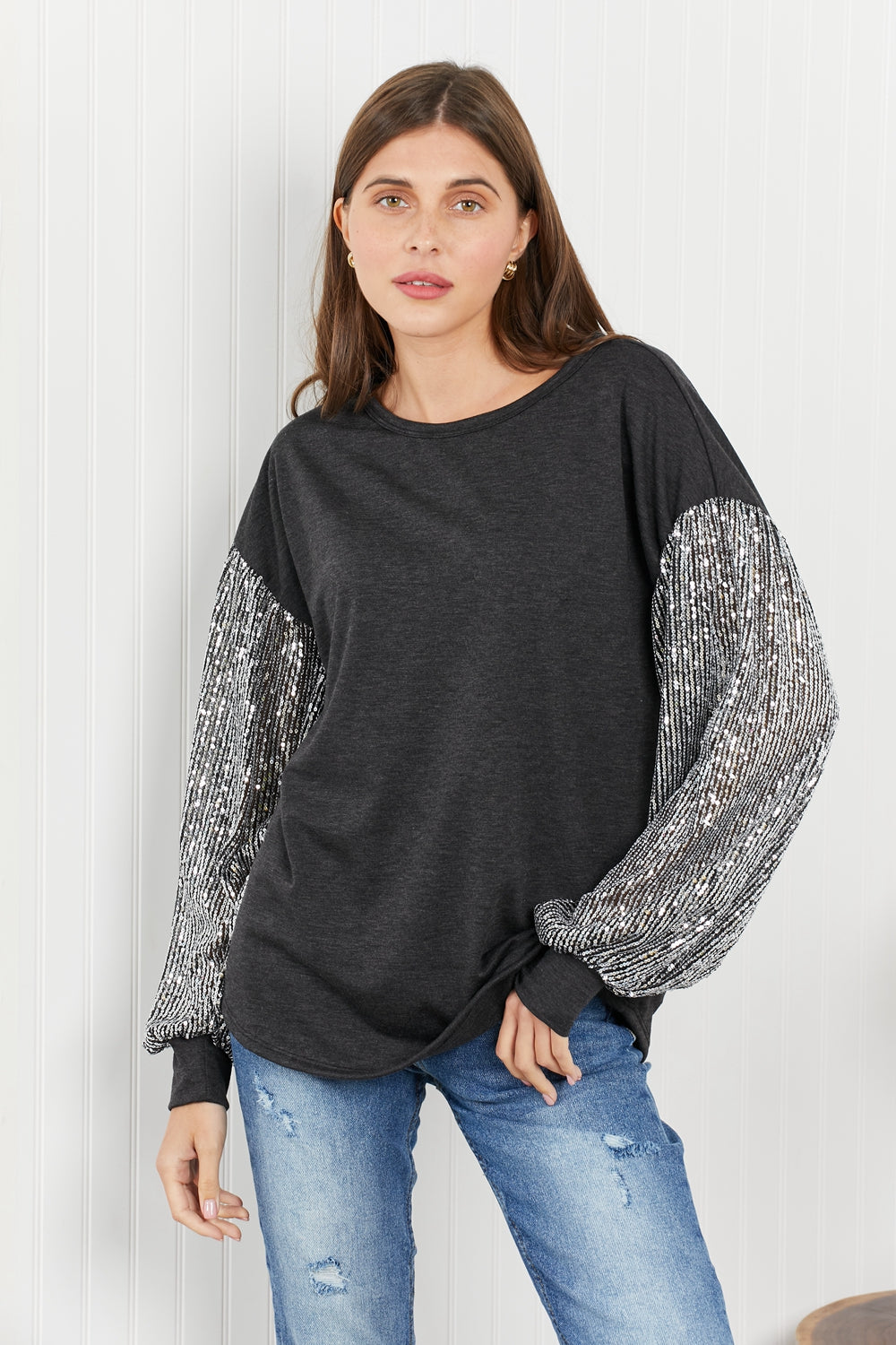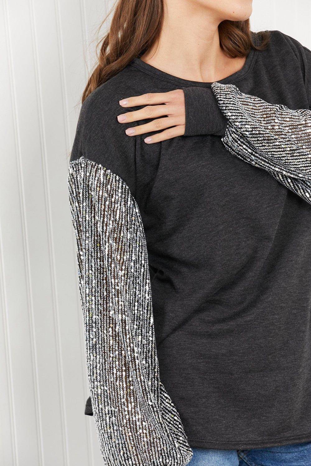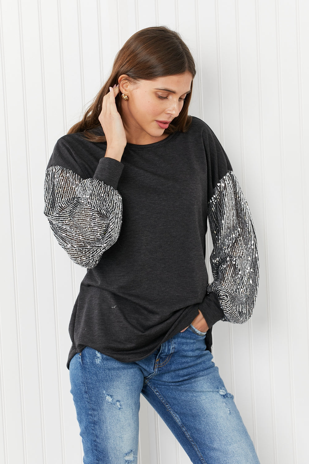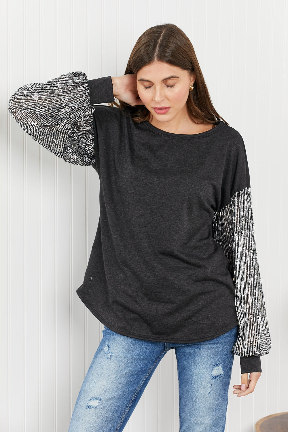 Just a touch of sparkle makes this top a show-stopper. It can be worn casually or dressed up for the upcoming holidays.