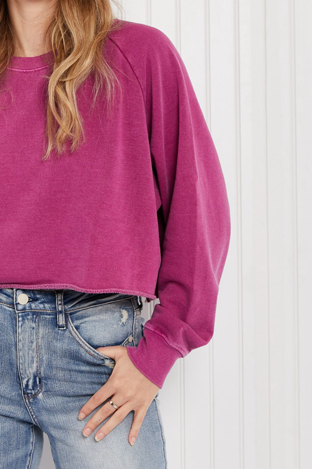 Our Cropped Rolled Hem Sweatshirt is the perfect layering piece for fall. The rolled hem, long sleeves and round neck are designed for comfort and easy wear.