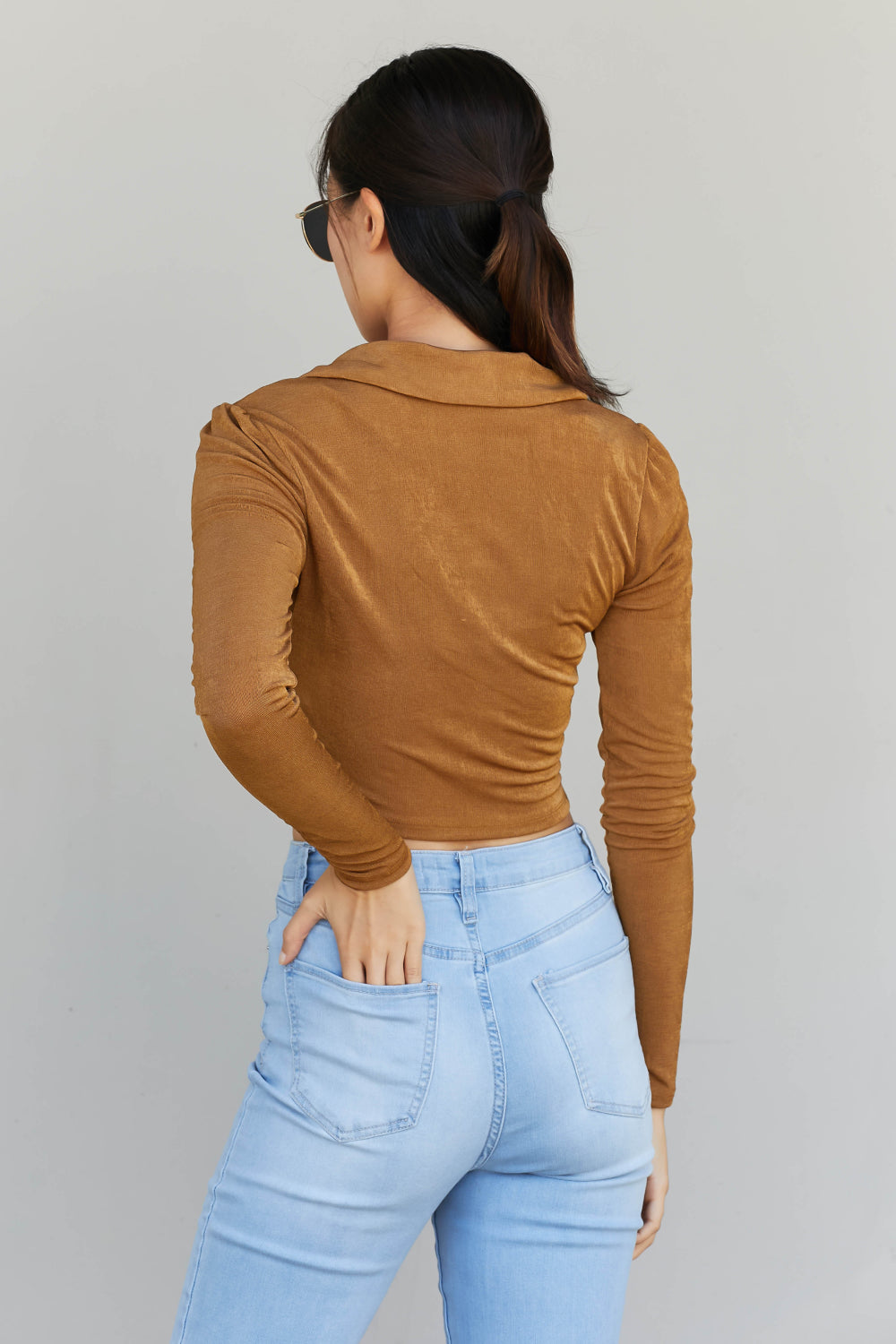 This collared top is preppy and sophisticated, everything you need for fall. The deep neckline, empire waist, and tight fit all add to the sultry illusion of this top. Pair it with some edgy bottoms to finish it off.