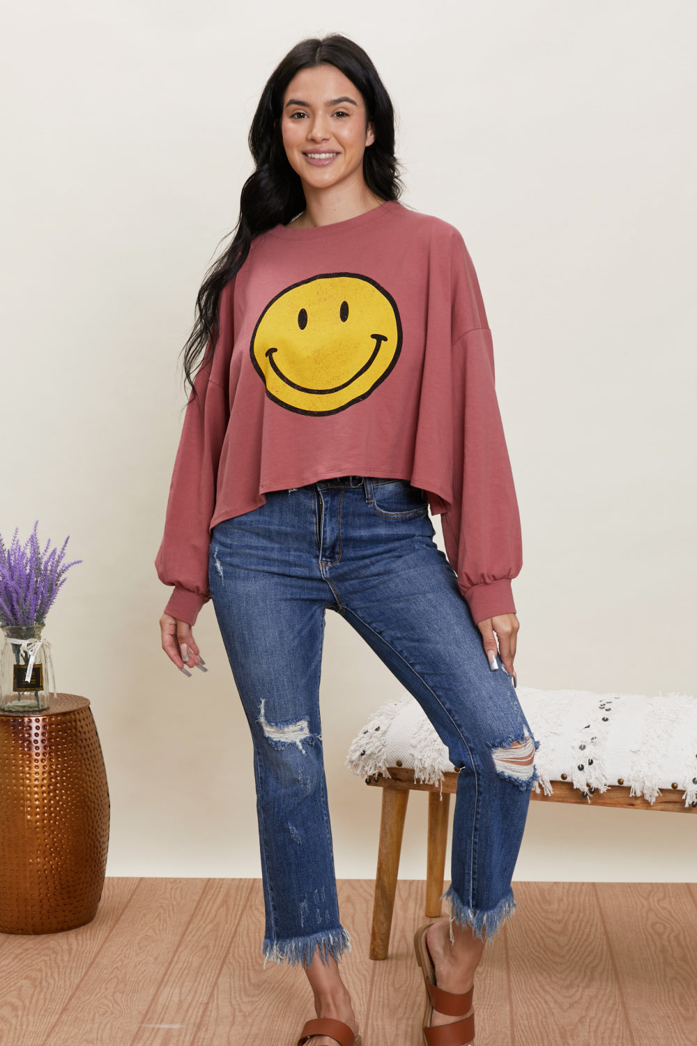 This smile graphic cropped tee is everything you need for a casual day. It has long balloon sleeves and an oversized fit, meaning you'll look great and feel even better!