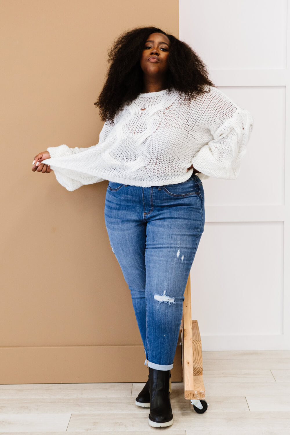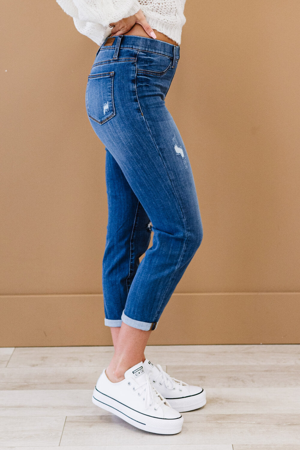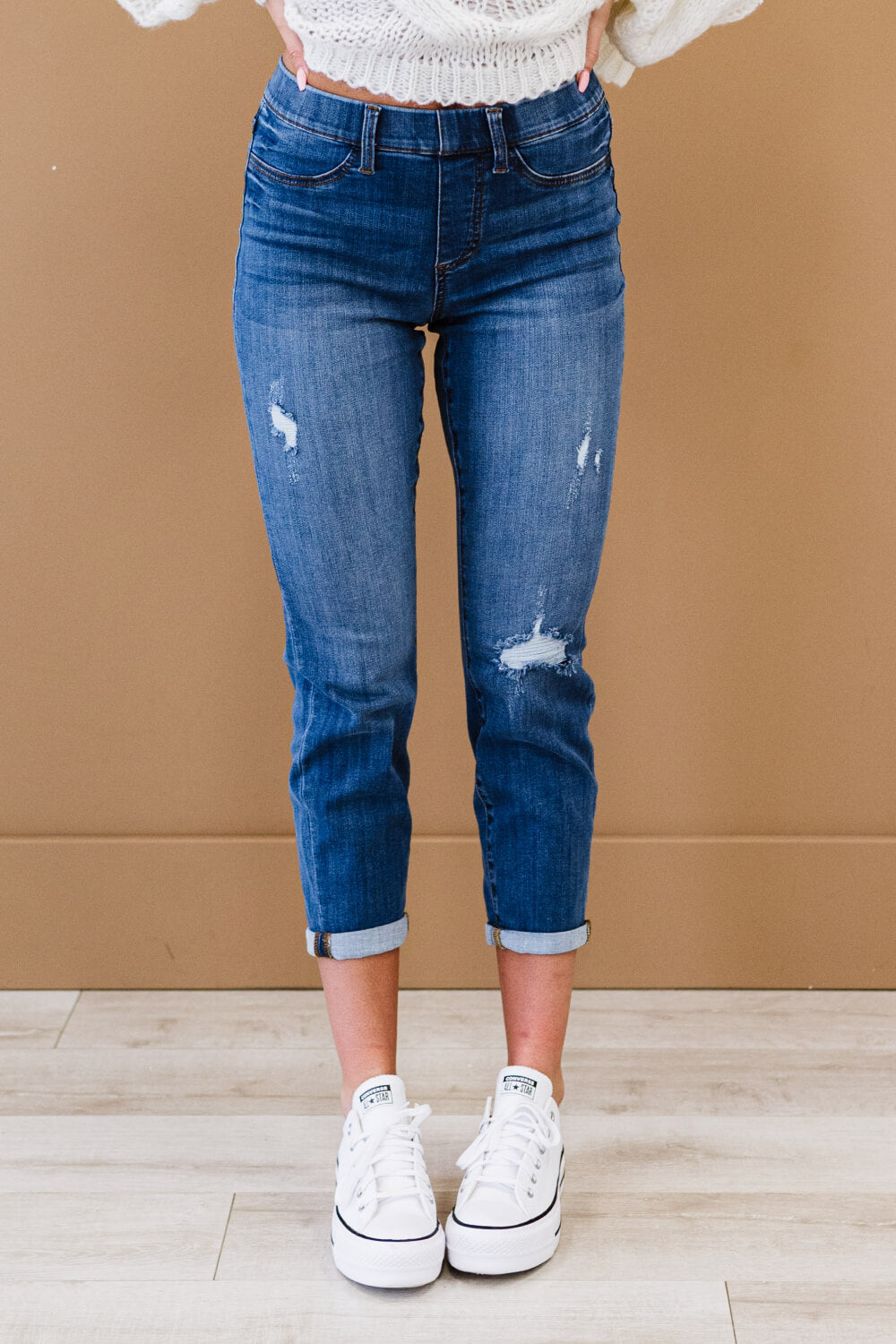 A pull-on, button-less elastic waist style cropped boyfriend jean is an ideal choice for looking your best while feeling like you're still in your PJ's! They have fully functional back pockets where you can still fit your phone and faux pockets in the front. Cuff them to add a little extra flair.