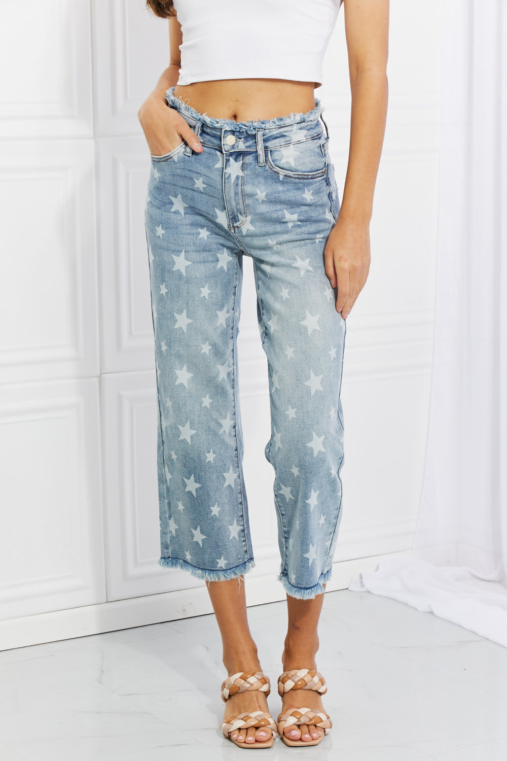 Adorned with an allover star print, these fun-loving jeans are sure to make you the star of the show! A high rise makes them comfy to wear, and the cropped length is finished off with a casual frayed hem. The straight fit makes these printed jeans wearable for a fun outing or everyday errands.
