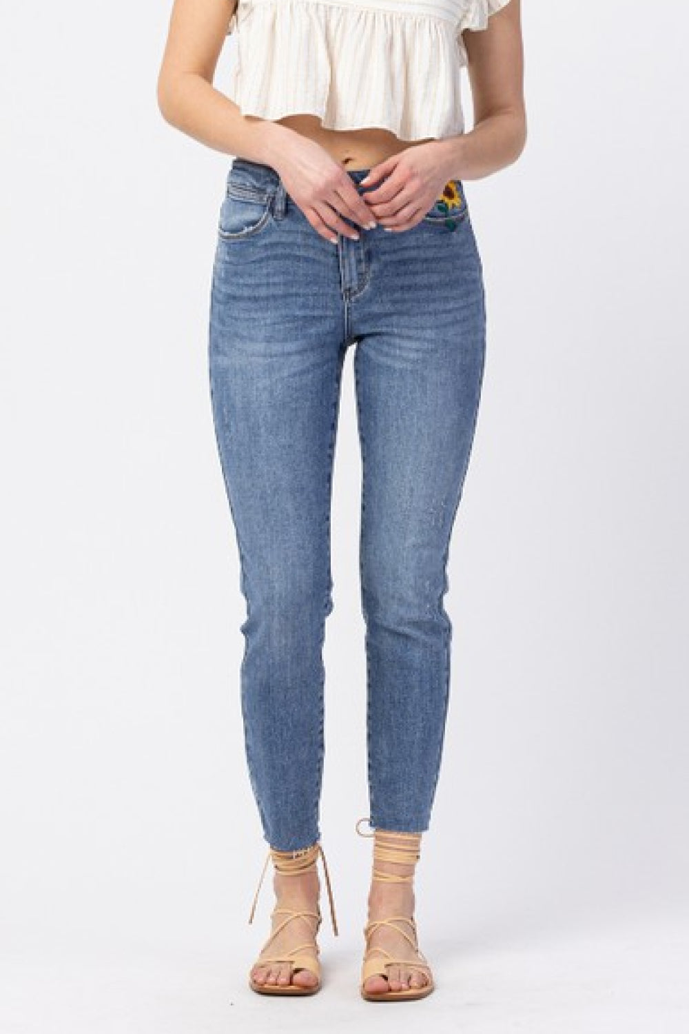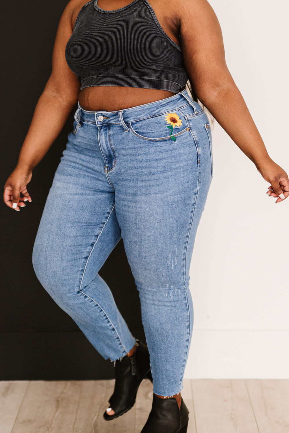 These relaxed jeans from Judy Blue have the cutest sunflower embroidery on the front pocket, along with a raw hem and high rise. Wear them with a cropped top or tuck in a top to make sure you display the sunflower detail!