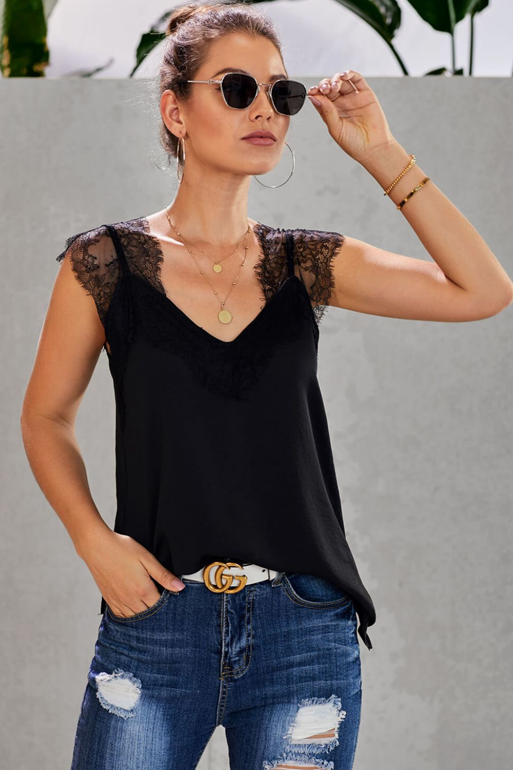 Every lady should have this tank top in her wardrobe for summer. Create a feminine look with eyelash lace shoulder and sexy v neckline. Perfect for daily wear, holiday, shopping, and so on.