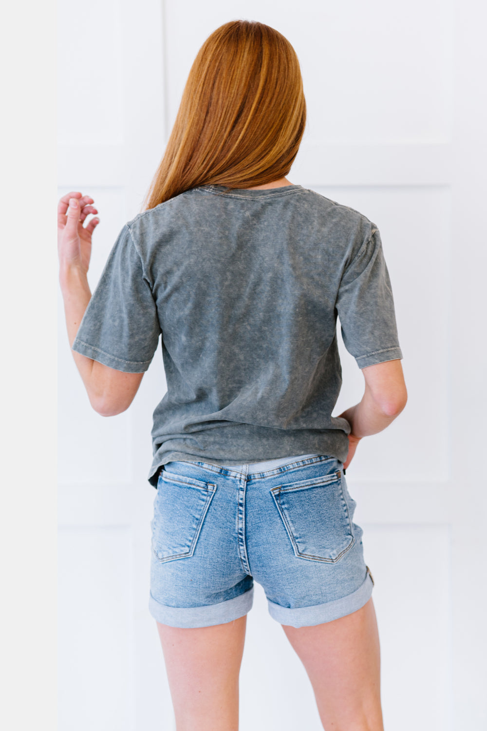 - Features: Ribbed neckline, dropped shoulders, short sleeves