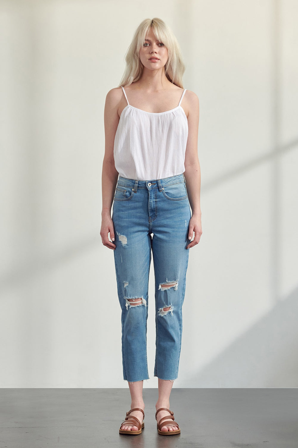 These jeans are sure to become your new favorite item. The distressed, high-rise cut provides a modern and flattering look while the raw hem detail adds another dimension to these cropped jeans.