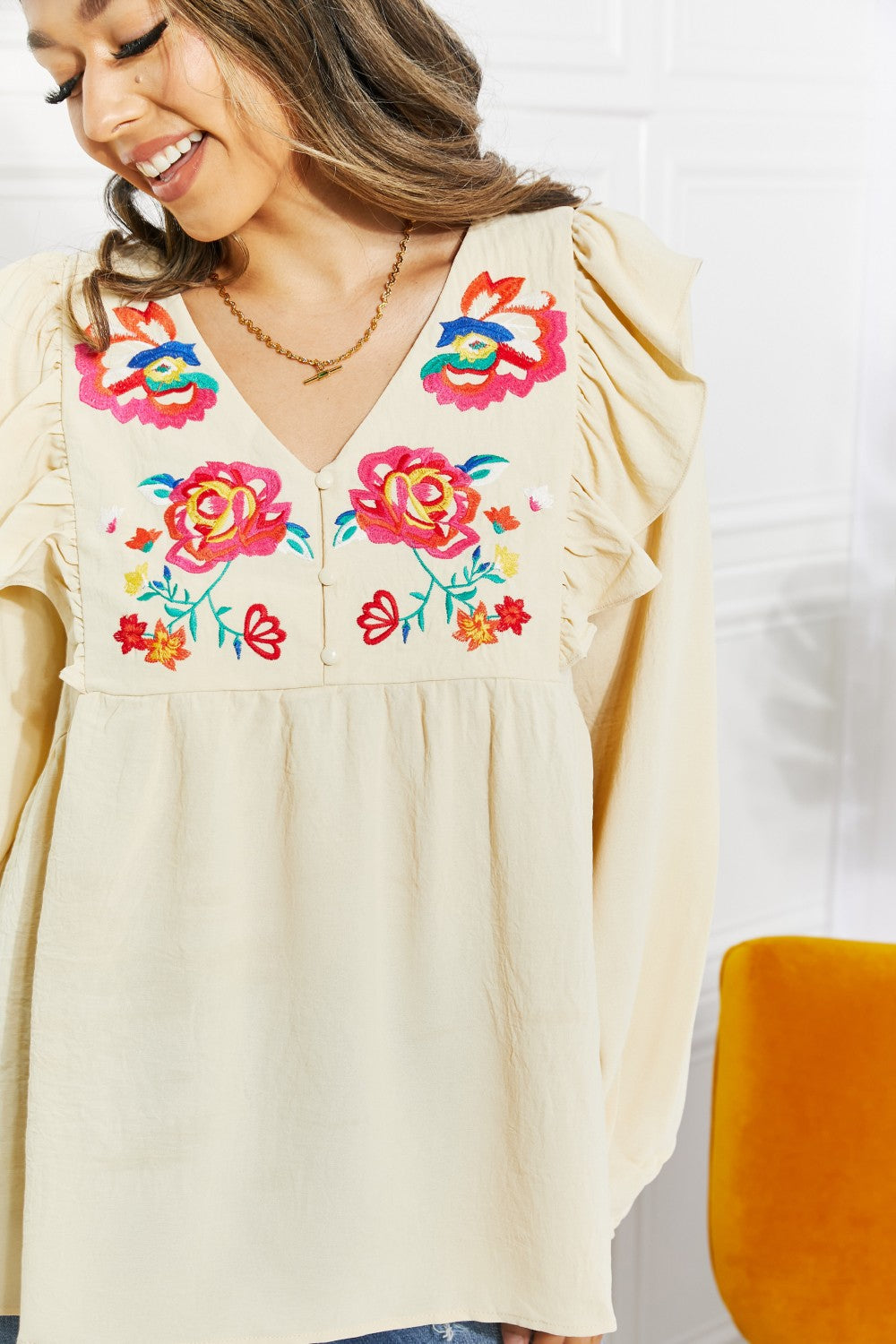 The Just Like Mama Embroidered Blouse comes in matching women's and girl's sizing, so you and your little one can both look your best! The woven top features elasticized long sleeves, ruffled details on the shoulders, and floral embroidery on the yoke for a perfectly pretty piece that is elegant enough to be worn by both you and your girl.