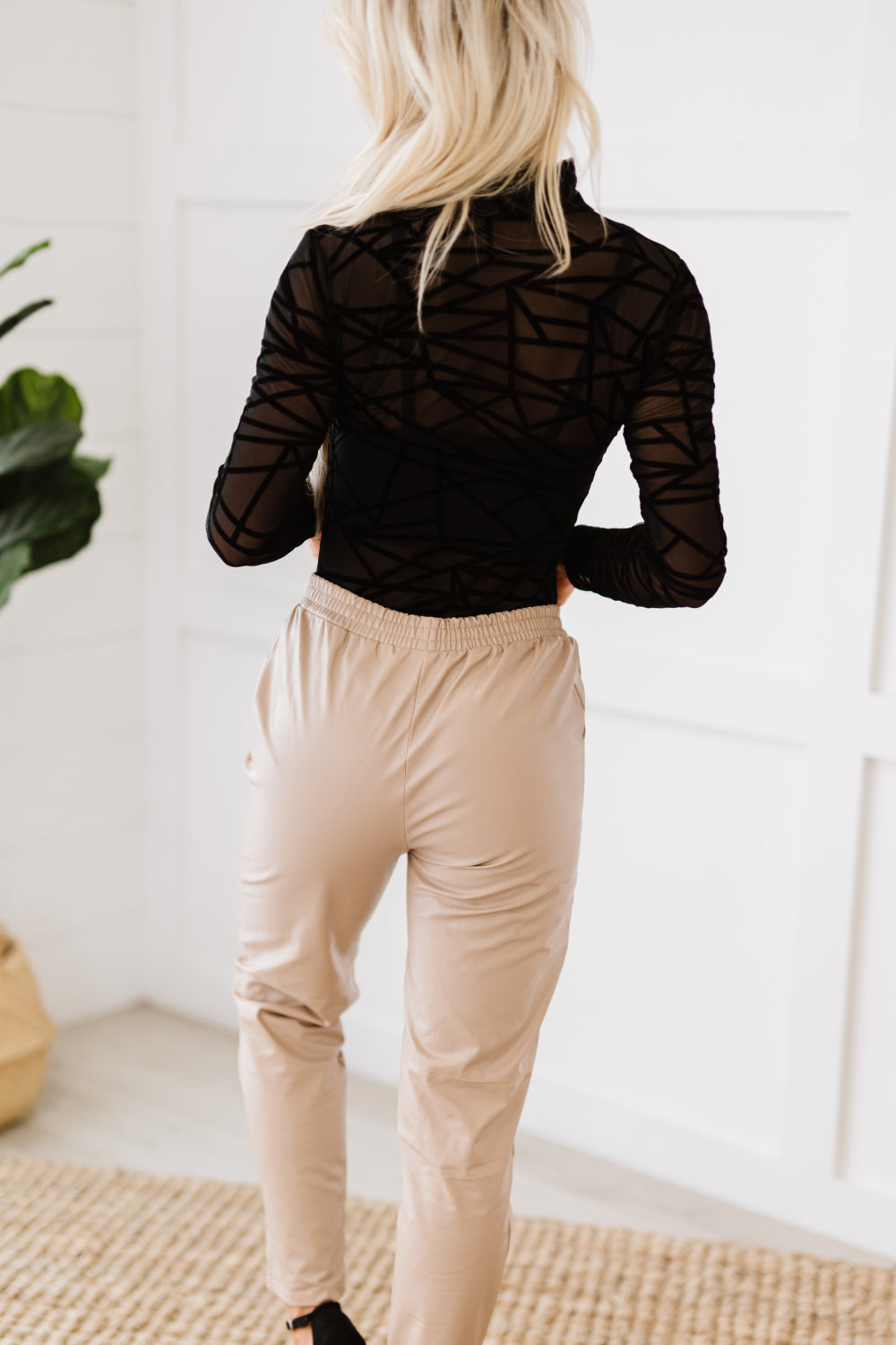 This sheer mesh bodysuit with long sleeves and a mock neck has a velvet geometric design allover. Underneath, add a bralette, or you could wear a bustier over the top!